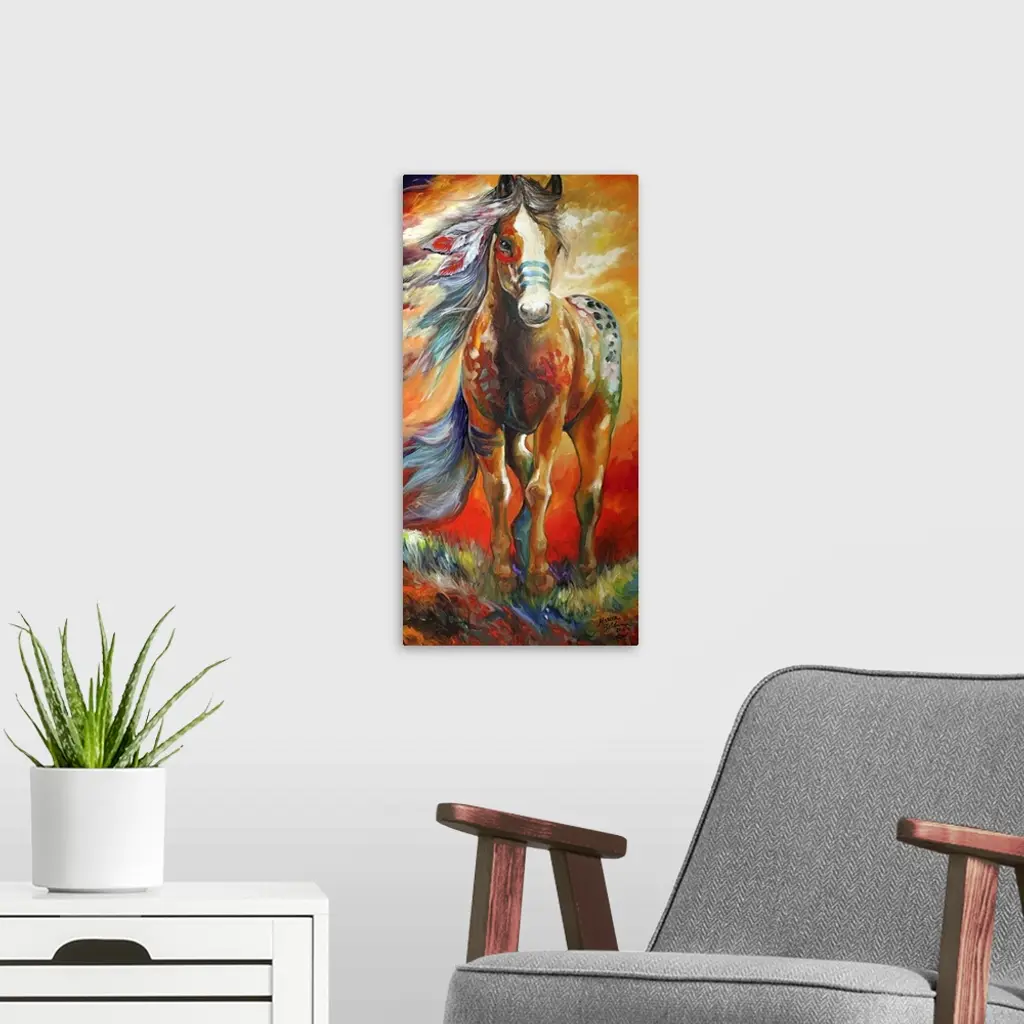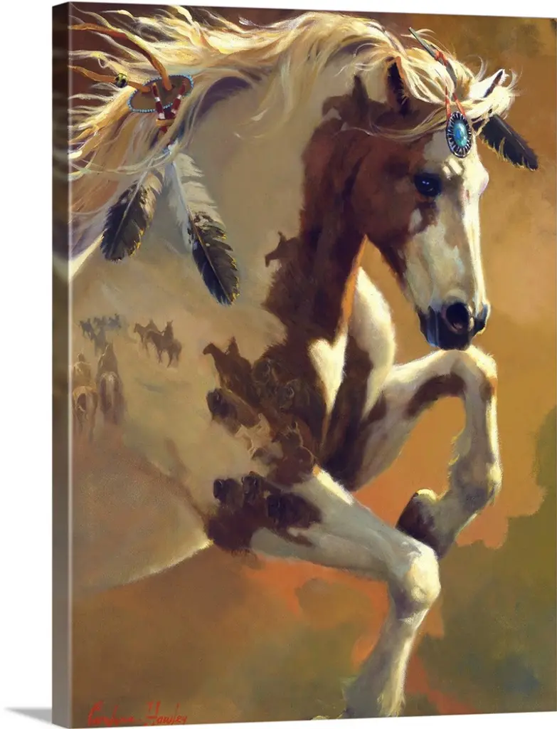 Large panel painting of an Indian War Pony standing up on high plains in warm tones.