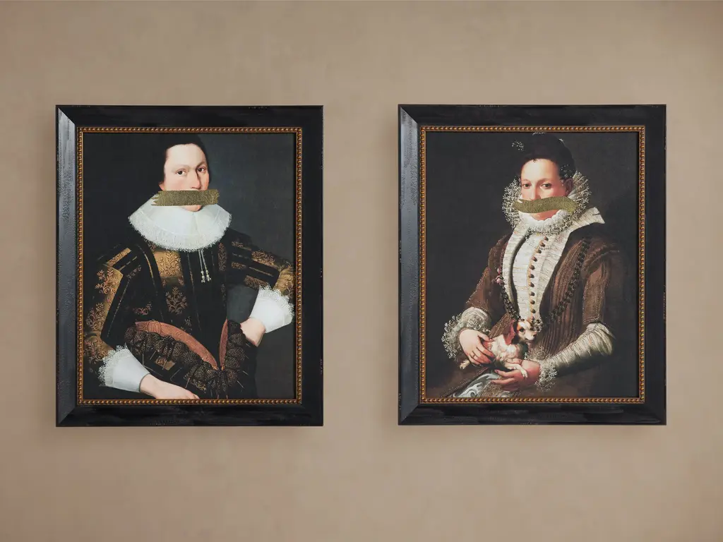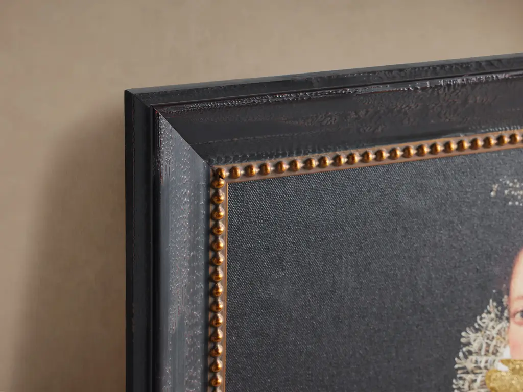 A modern reinterpretation of Dutch masterworks, artisans hand apply gold leafing for a bold and contrasting pop of color and texture against an otherwise traditional subject matter. Designed with ornate frames, these giclee reproduction prints are ideal for transitional spaces that blend a touch of tradition with a contemporary flair. Gallery wrapped giclee print on canvas with hand-applied gold leaf details. Wooden frame features a distressed black and antiqued gold finish. Hangs vertically from back-mounted wire.