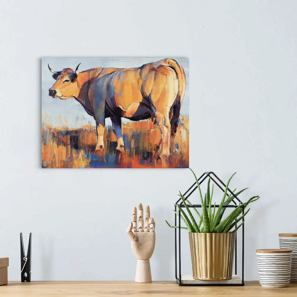 Contemporary painting of a large cow in a field in harsh sunlight.