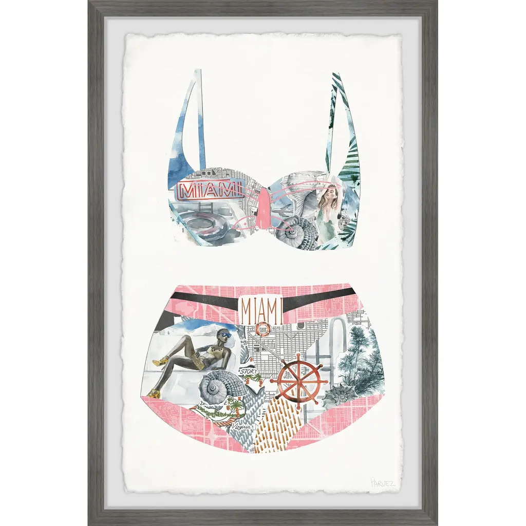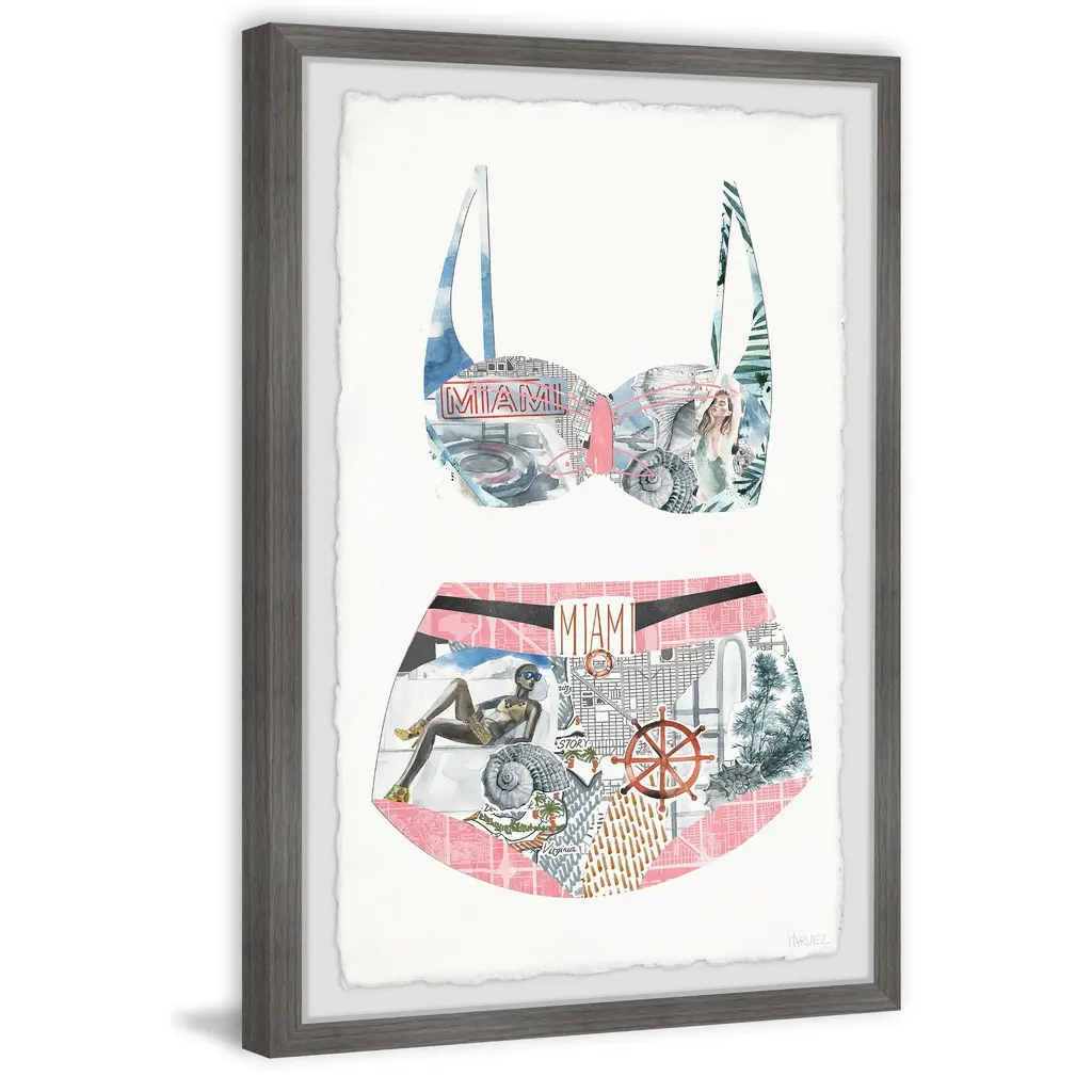 Perfect for beach homes and vacation spots, this print features a bikini with Miami Beach on it. Proudly printed in the USA, this piece is printed on high quality archive paper and professionally hand-framed. With wall-mounting hooks included, this artful accent is ready to hang up as soon as it reaches your front door. • Top quality Giclee print on high resolution Archive Paper • Hand cut deckled edges • High quality durable non-warping frame • Finished under shatter resistant plexiglass • Arrives ready to hang • Includes a certificate of authenticity • Printed in the USA • Artist signature on the front