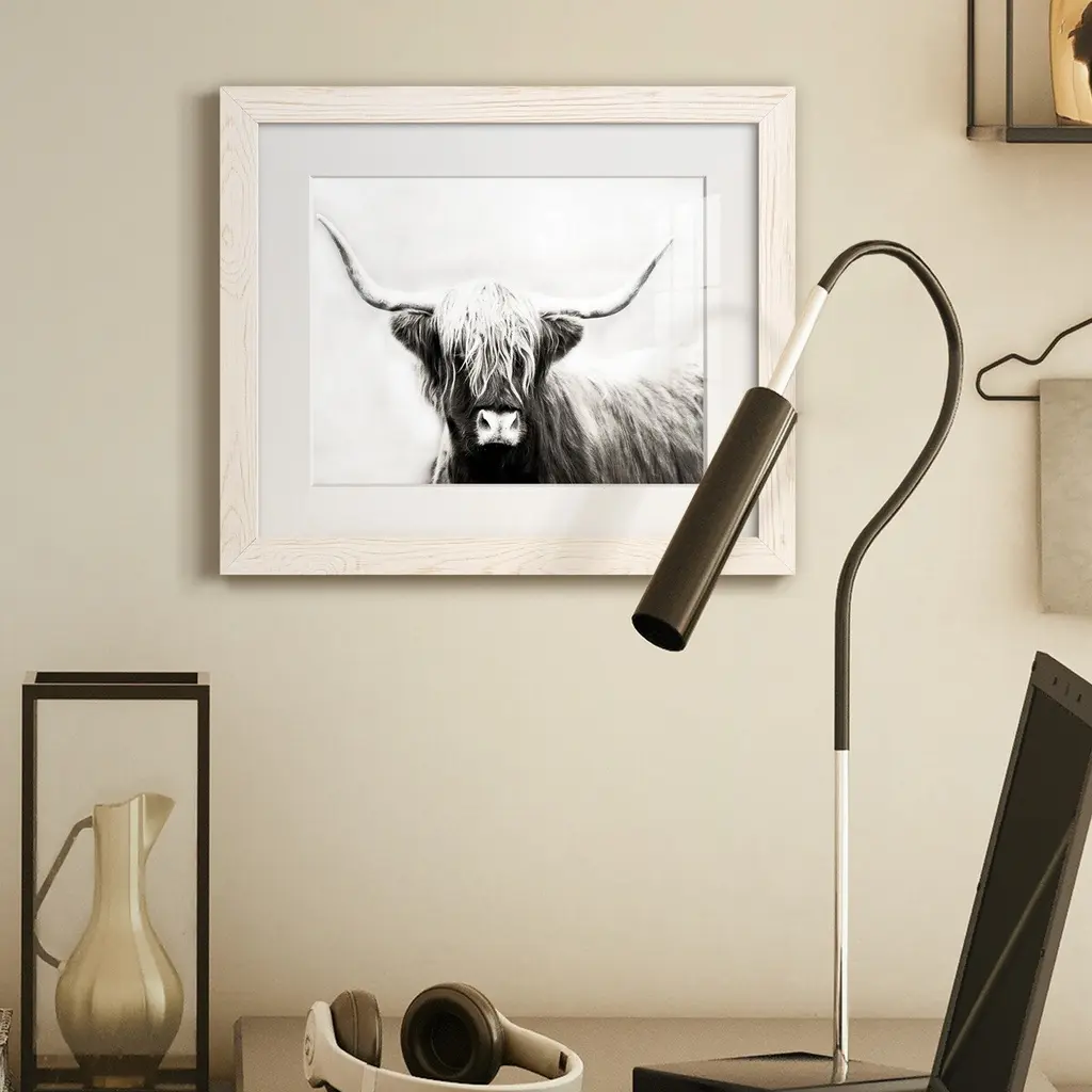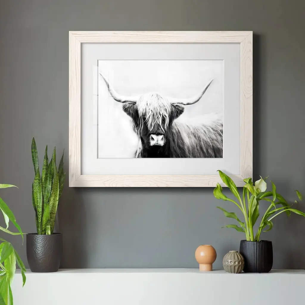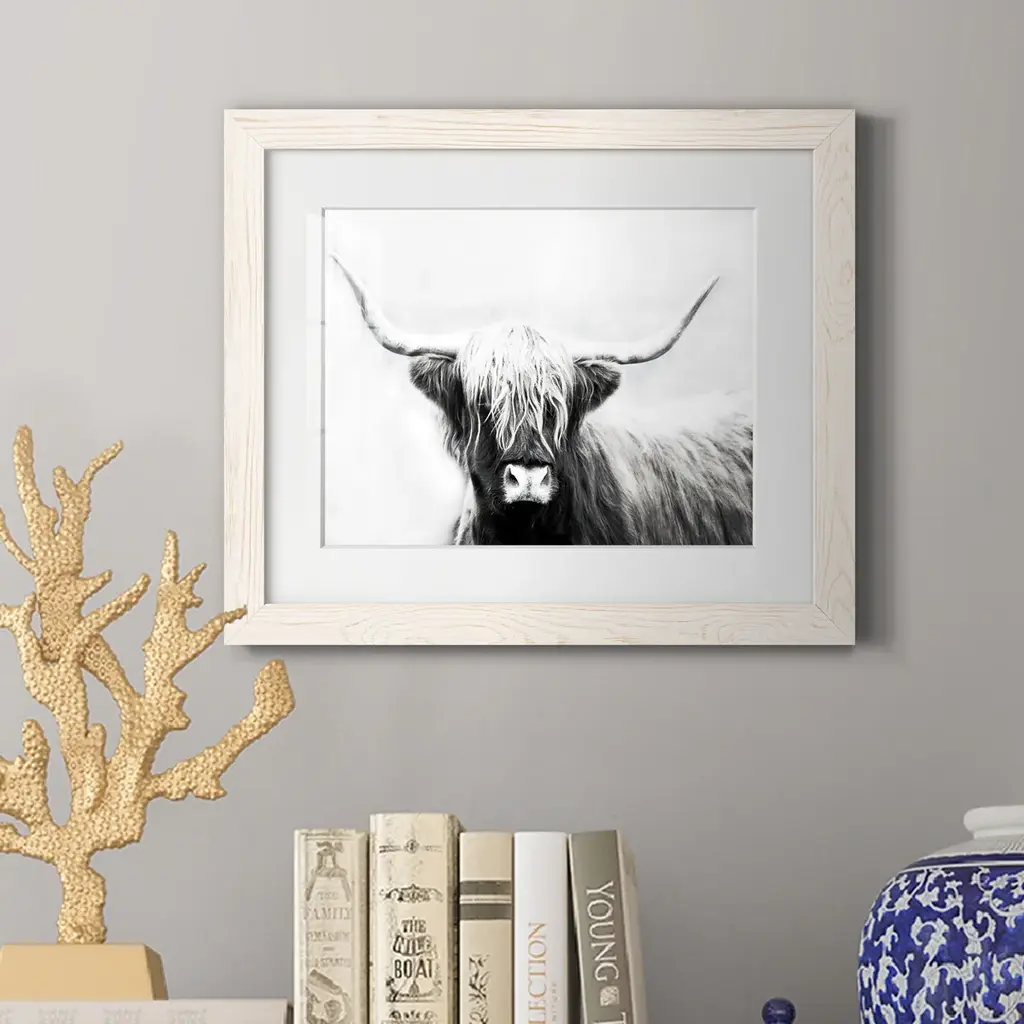 Highland Longhorn-Premium Framed Print - Ready to Hang Framed in distressed wood and available in an array of sizes and colors Each piece is joined and assembled by hand and comes ready to hang 2 INCH BEVELED MATTE BOARD PLEXIGLASS COVERING READY TO HANG MADE IN THE USA SOLID WOOD FRAME MADE IN USA FADE RESISTANT GICLEE PRINTING on Canvas or Paper