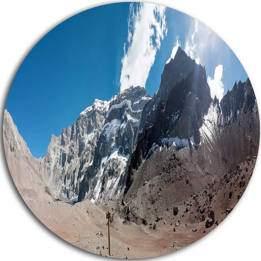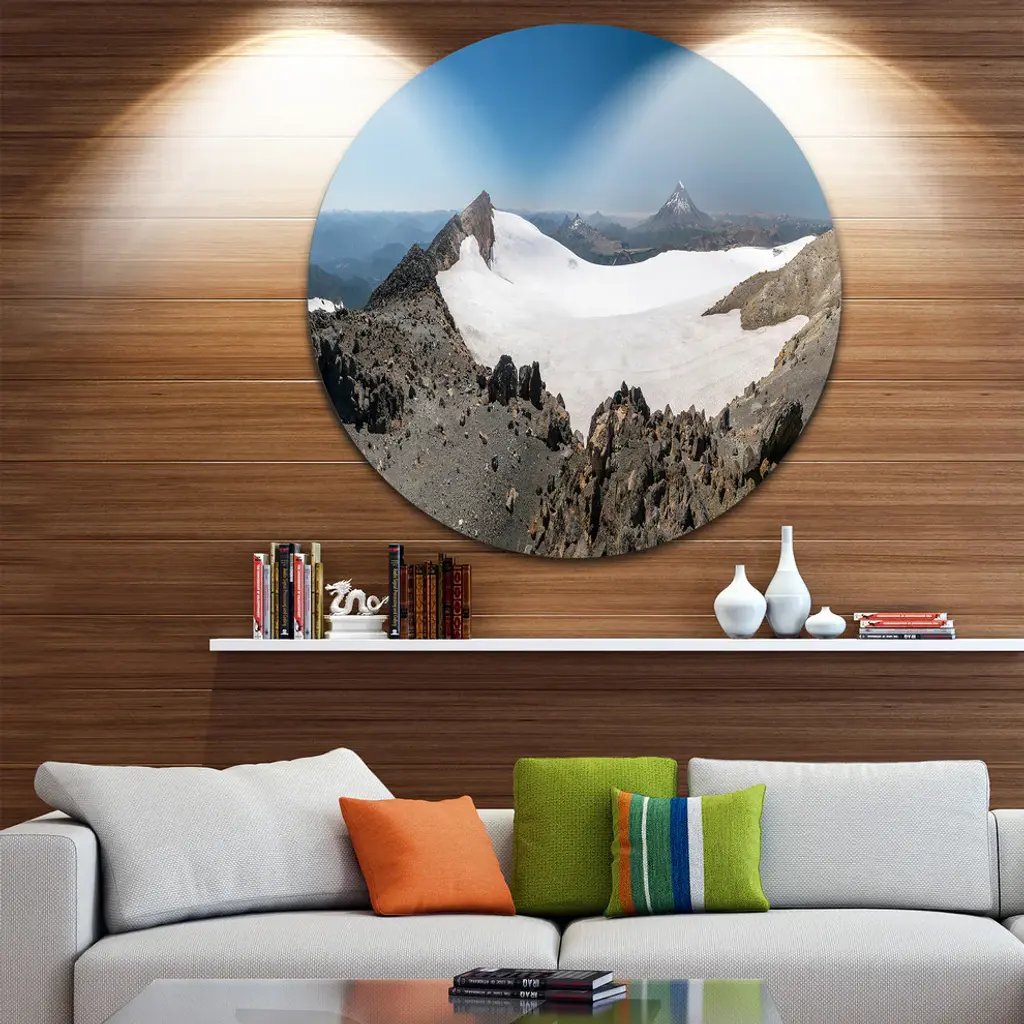 Bring Contemporary Abstraction to your home with this large Circle Metal wall art. This Hiking to Vulkan Quetrupillan Metal Artwork makes it the focal point of any room or office. - White Gloss Coating ensures colors are extra vibrant with light reflection.- Aluminum grade Sheet Metal with 1 inch mounting frame on the back giving the illusion that the artwork is floating on the wall..- Mounting Brackets are included along with instructions.- High Quality Digital images are created directly into a glossy aluminum panel producing a stunning and captivating print into the glossy finish of the metal.- Water, Fire and Scratch resistant HD Aluminum panels.- Looks better than any photo paper and guaranteed to last at least 20 years- Easy to clean with a microfiber cloth. Colors are far superior to regular Canvas Art. - Easy to Hang