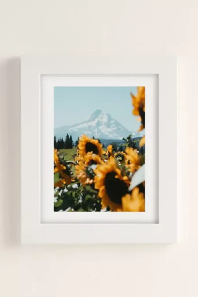 Art print by Hillary Murphy featuring a photograph of a mountainscape behind a vibrant sunflower field. Printed on archival paper made from cotton pressed in Italian mills, this high-quality art print is available in sizes and frames just right for your space. First select your frame (or go frameless), then select your size. **About the Frames** \- The exact width of each frame may vary slightly \- All frames are manufactured in the US \- Matte frames are durable poly \- Wood frames are recycled wood \- All are fitted with protective plexiglass \- Finished with wood moldings, archival backer and protective bumpers **Size** \- Available in multiple sizes \- Use the Size Guides to find the size that fits your space **Content + Care** \- Wipe clean \- Made in the USA