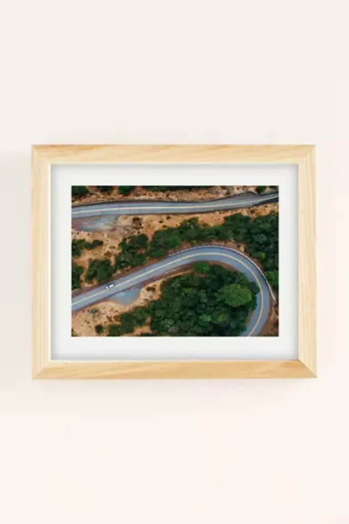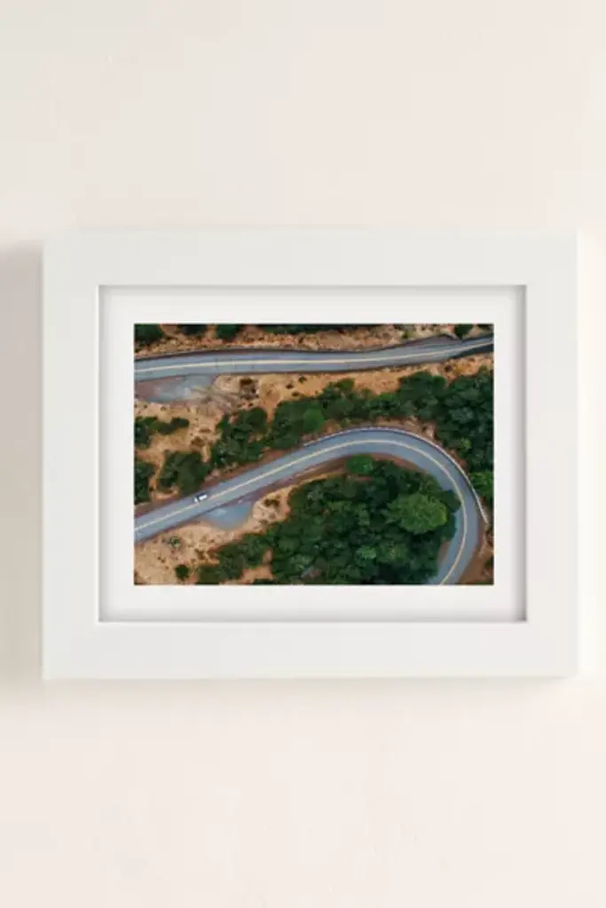Art print by Hillary Murphy featuring a photograph of a winding road. Printed on archival paper made from cotton pressed in Italian mills, this high-quality art print is available in sizes and frames just right for your space. First select your frame (or go frameless), then select your size. **About the Frames** \- The exact width of each frame may vary slightly \- All frames are manufactured in the US \- Matte frames are durable poly \- Wood frames are recycled wood \- All are fitted with protective plexiglass \- Finished with wood moldings, archival backer and protective bumpers **Size** \- Available in multiple sizes \- Use the Size Guides to find the size that fits your space **Content + Care** \- Wipe clean \- Made in the USA