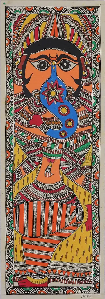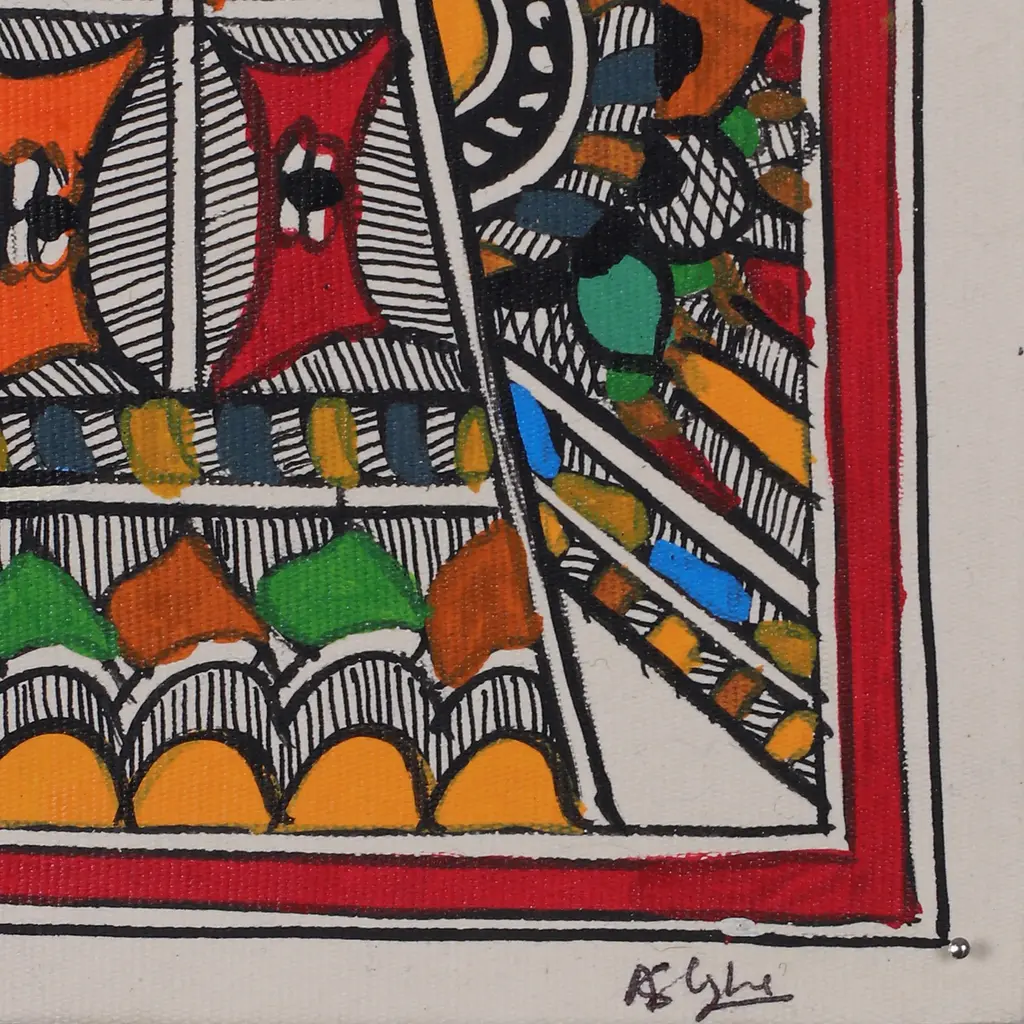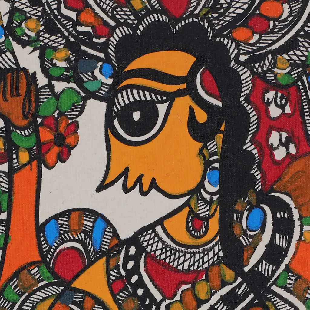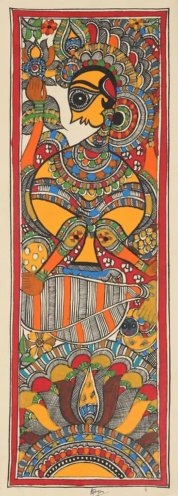 Saraswati, the embodiment of wisdom, knowledge, music and the arts in Hindu mythology, serves as a perennial muse for artists such as Devendra Kumar Jha. In his remarkable Madhubani creation rendered with natural dyes on handmade paper, Saraswati is portrayed adorned in resplendent attire, bedecked with impressive jewelry, gracefully mounted on a swan. Jha's artistic rendition captures the essence of this divine figure, offering an alluring visual testament to the goddess's multifaceted domains.