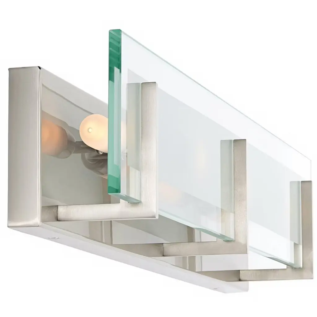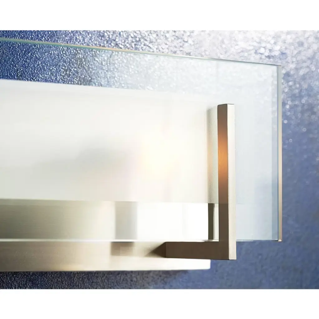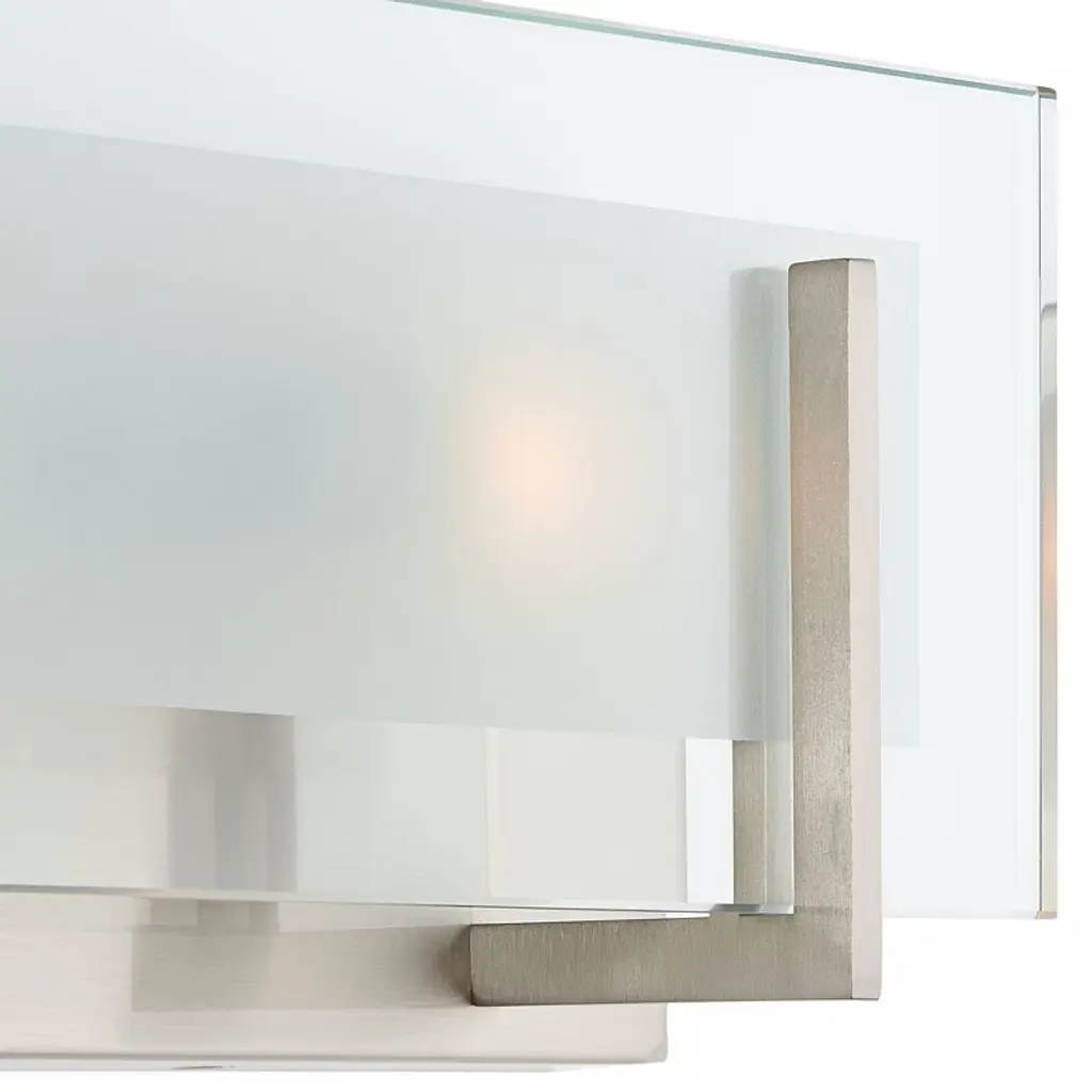 Boasting a richly transitional design, this brushed nickel vanity light handsomely fuses contemporary, industrial, and art deco styles. A clear glass panel with rectangular etching is mounted on L-shaped yokes offering structure and artistic balance. This ADA compliant bath light is part of the Latitude collection of Hinkley lighting.