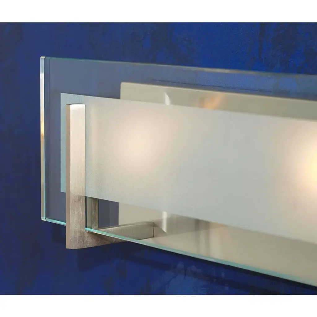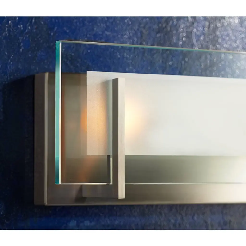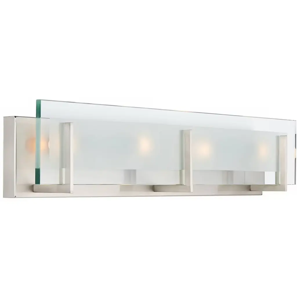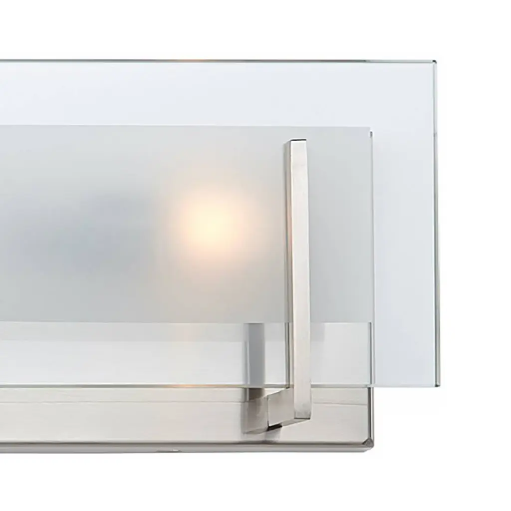 Boasting a richly transitional design, this brushed nickel vanity light handsomely fuses contemporary, industrial, and art deco styles. A clear glass panel with rectangular etching is mounted on L-shaped yokes offering structure and artistic balance. This ADA compliant bath light is part of the Latitude collection of Hinkley lighting.