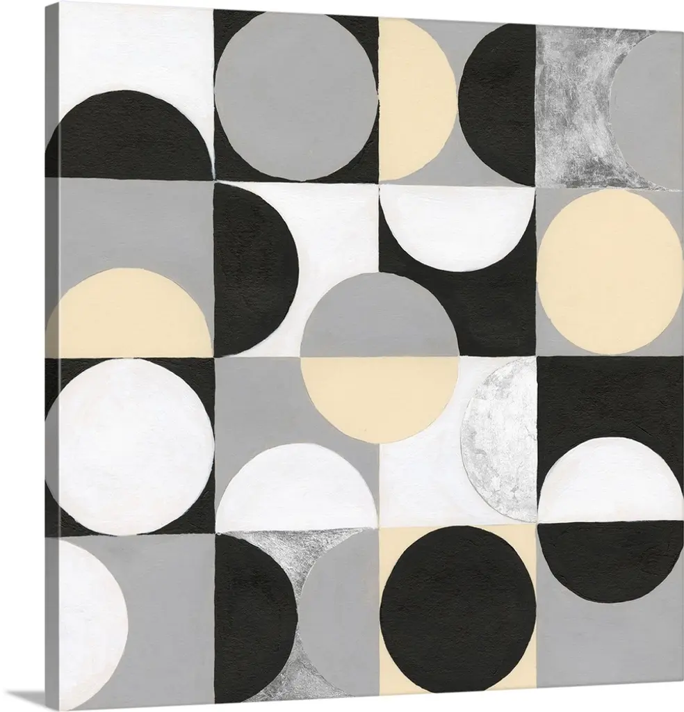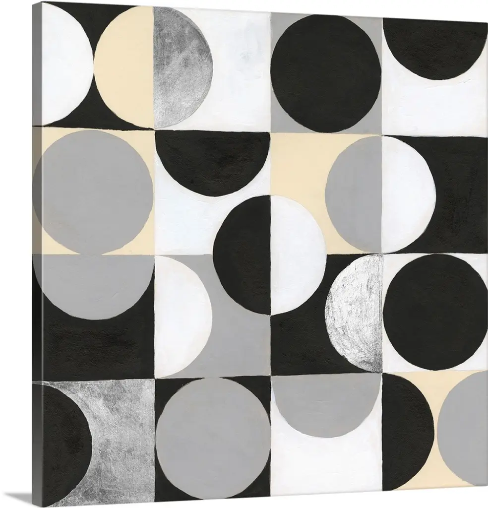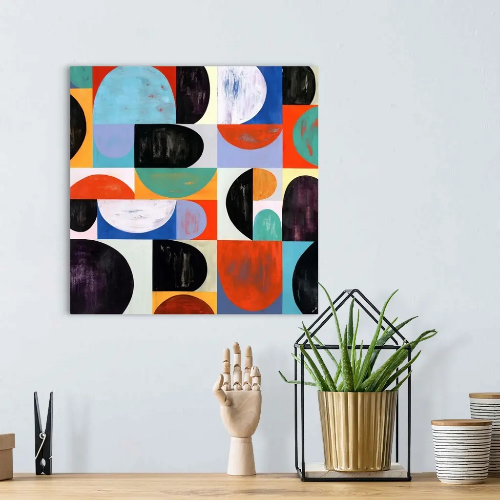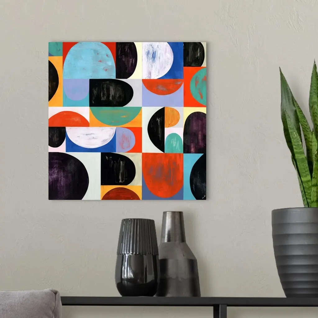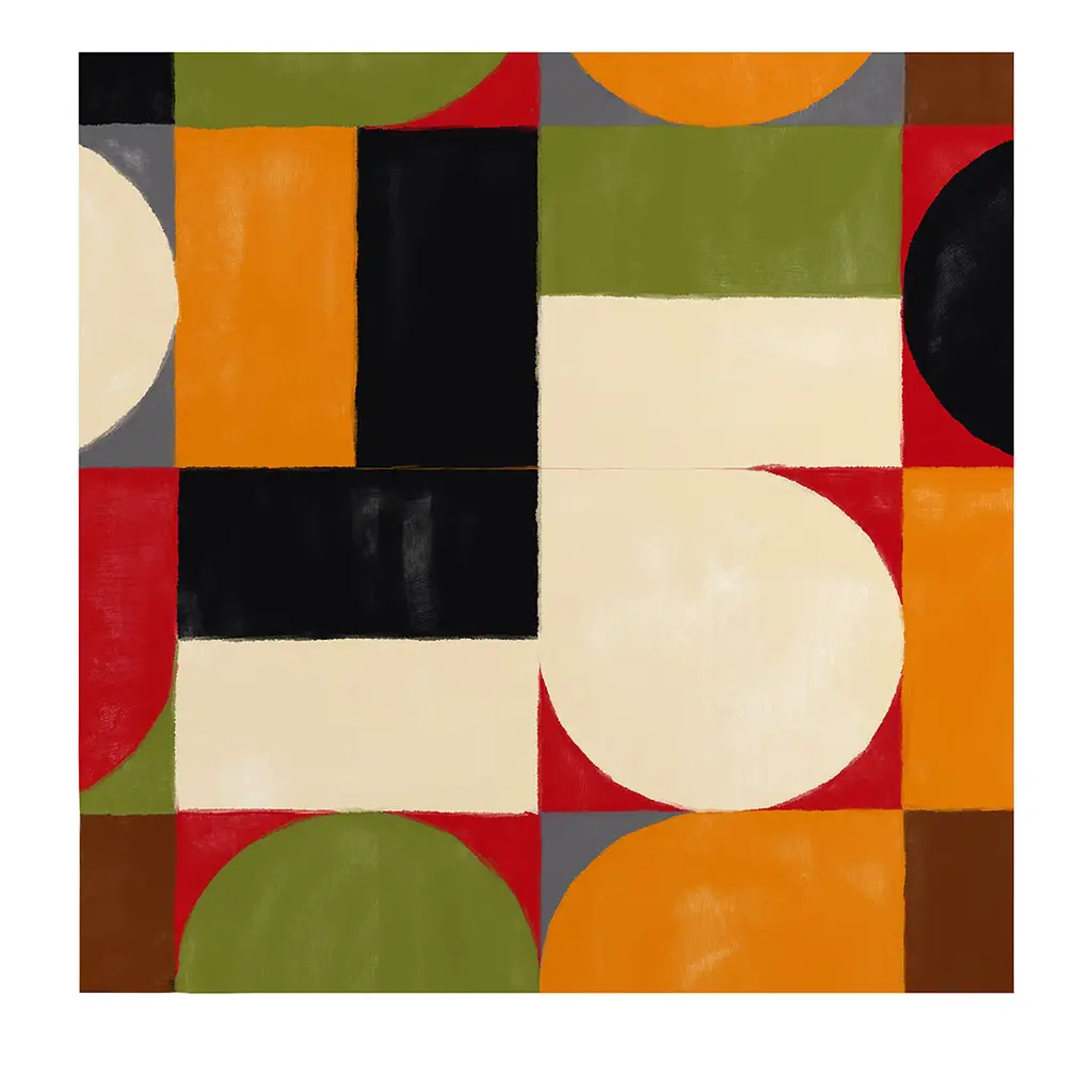 Abstract painting with a mid-century feel using organic shapes in different colors to create obscure patterns.
