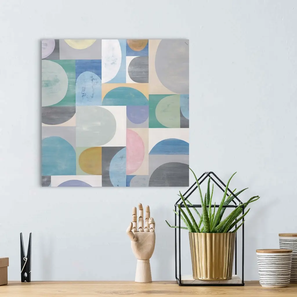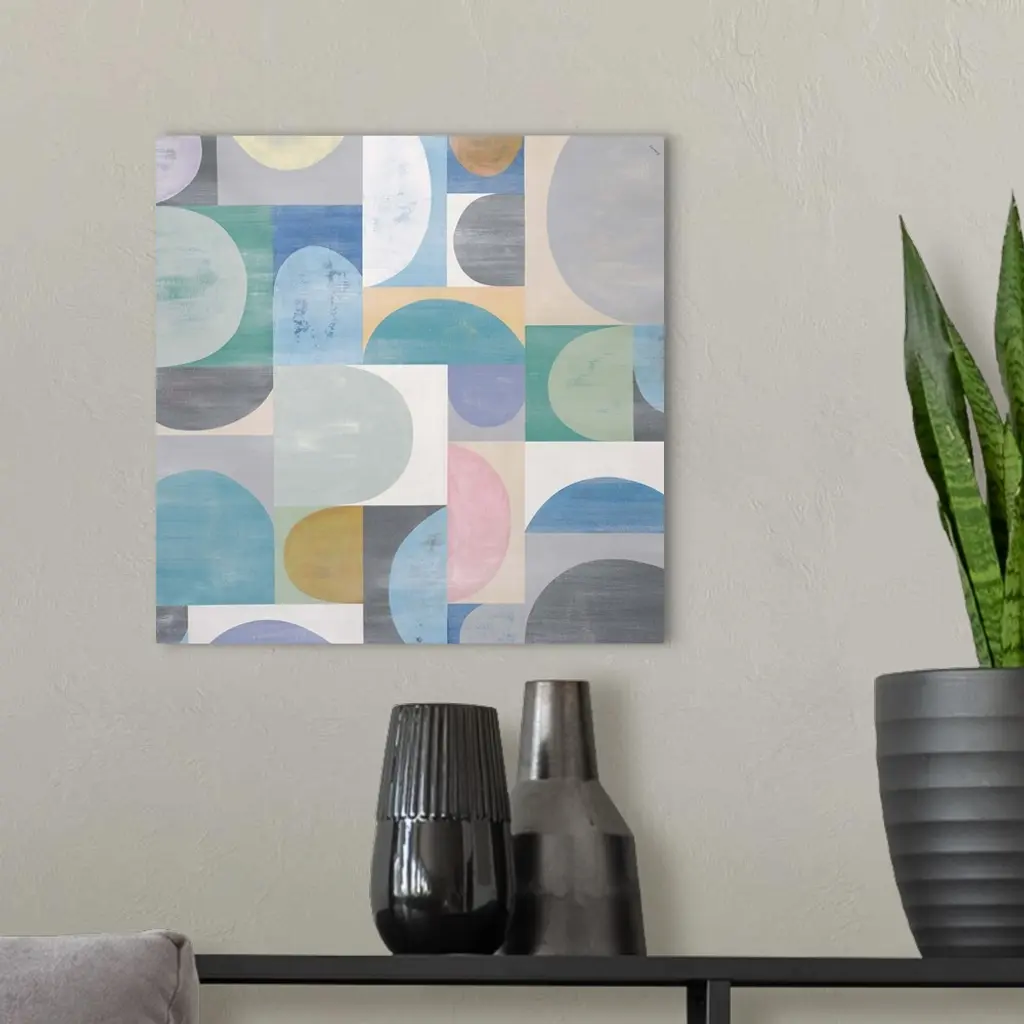 Abstract painting with a mid-century feel using organic shapes in different colors to create obscure patterns.