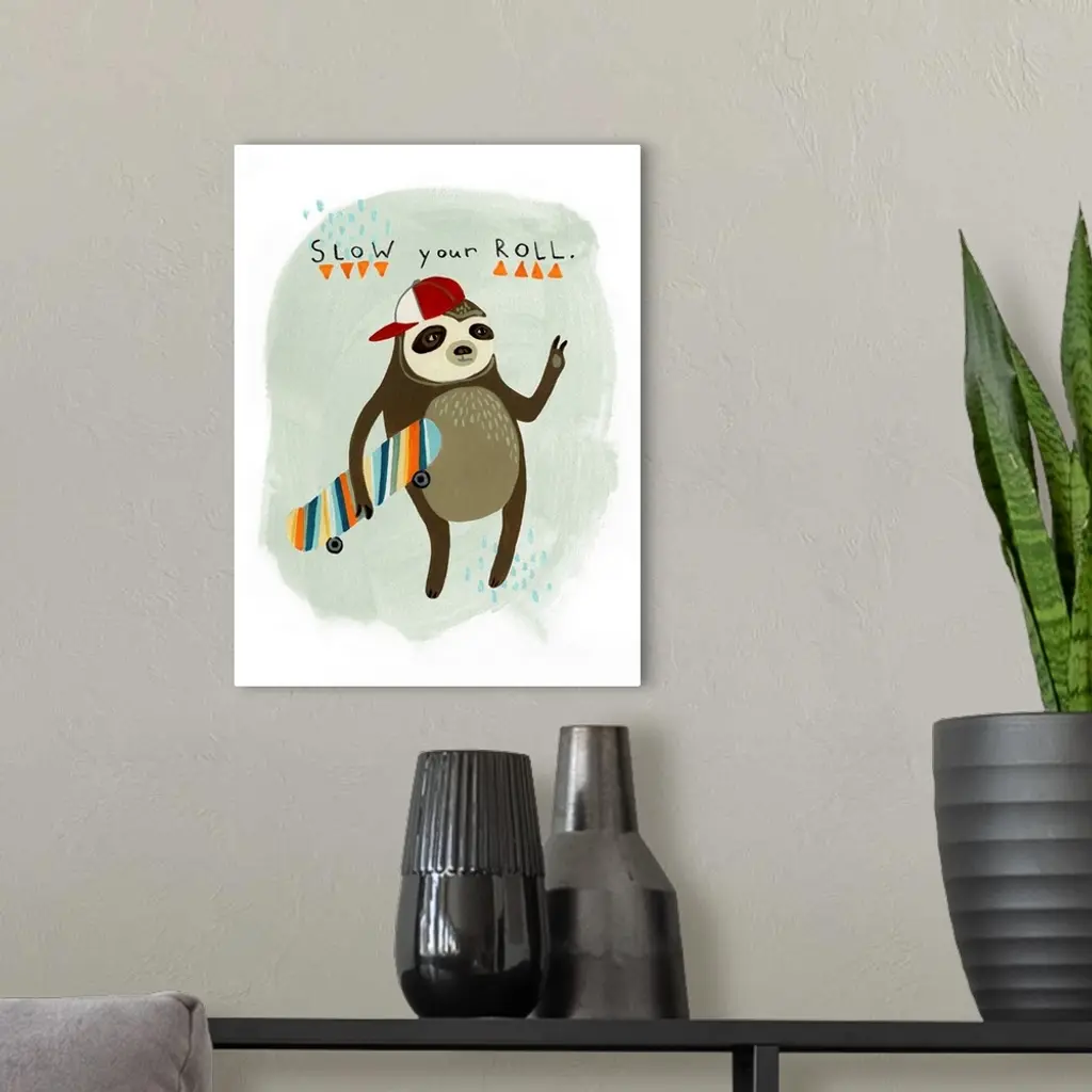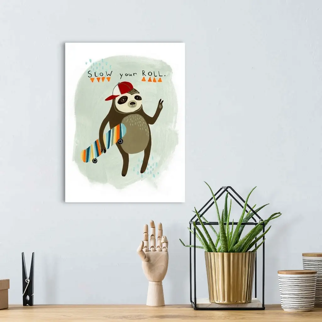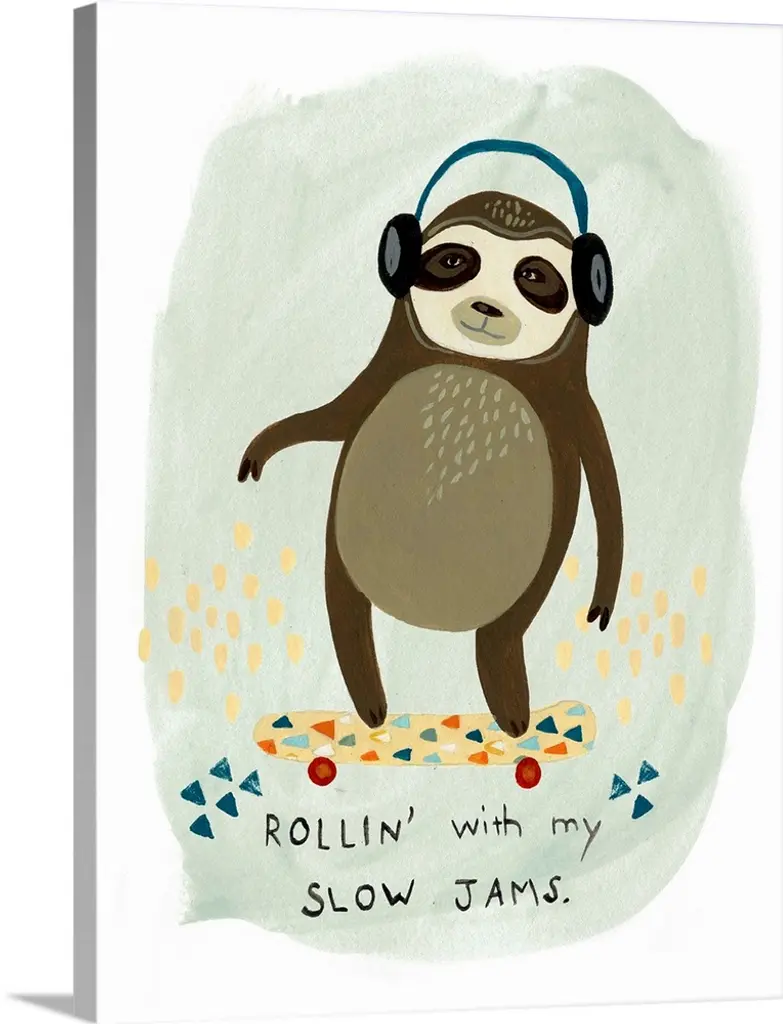 Fun children's artwork of a hipster sloth with a skateboard and backwards cap.