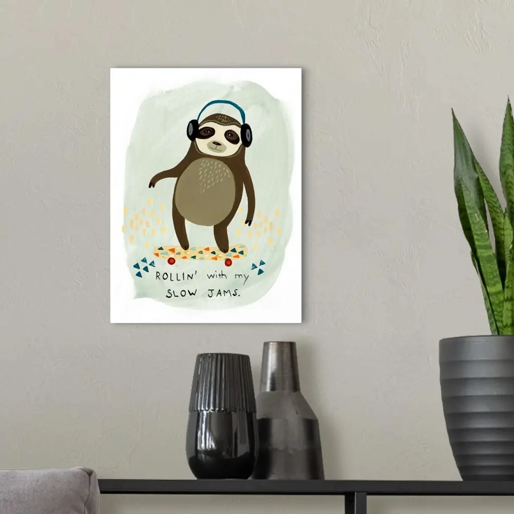 Fun children's artwork of a hipster sloth with a skateboard and headphones.