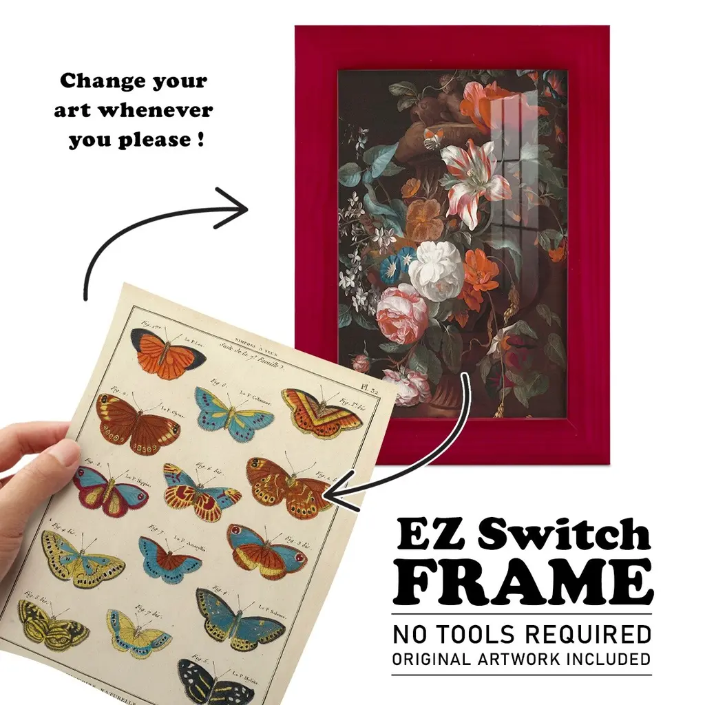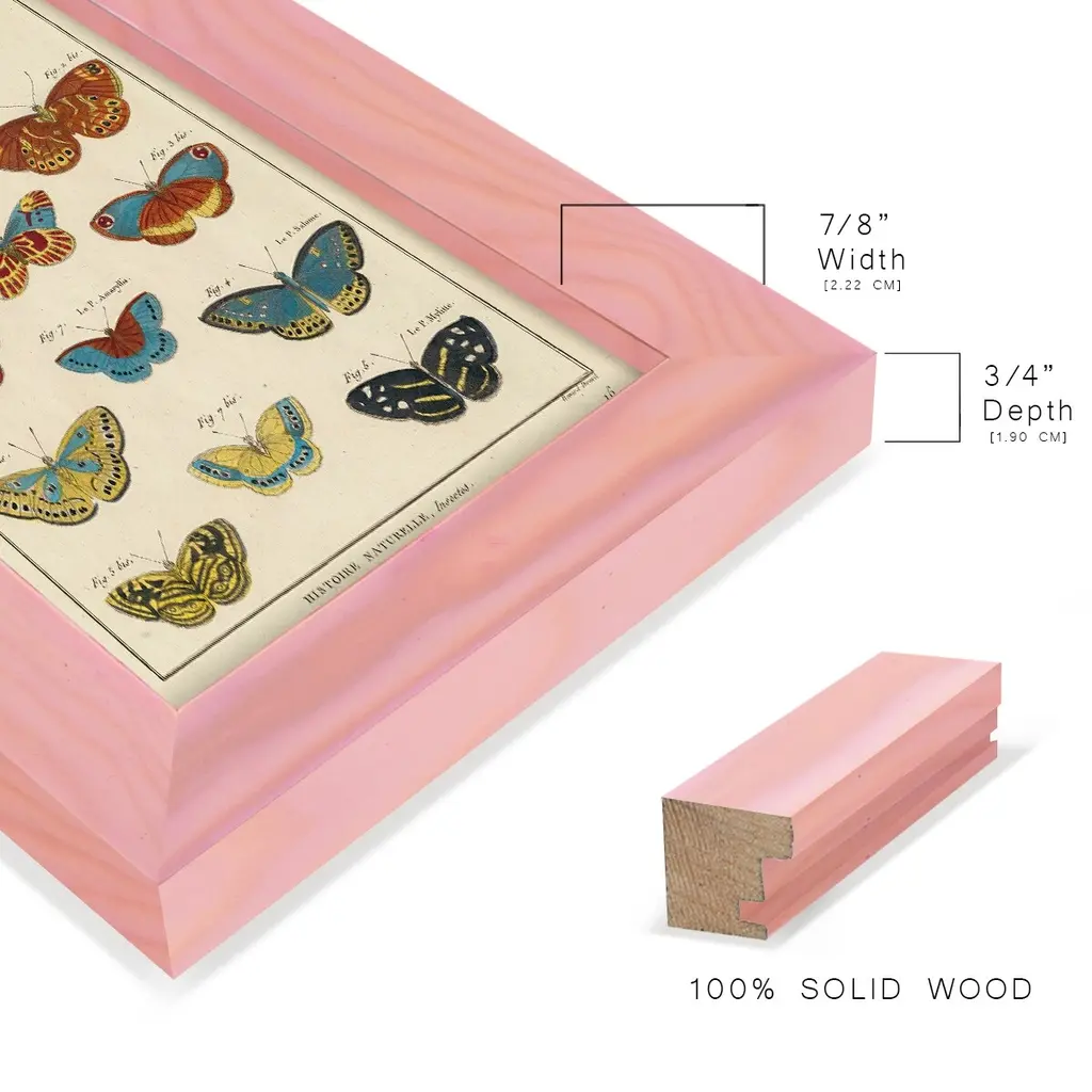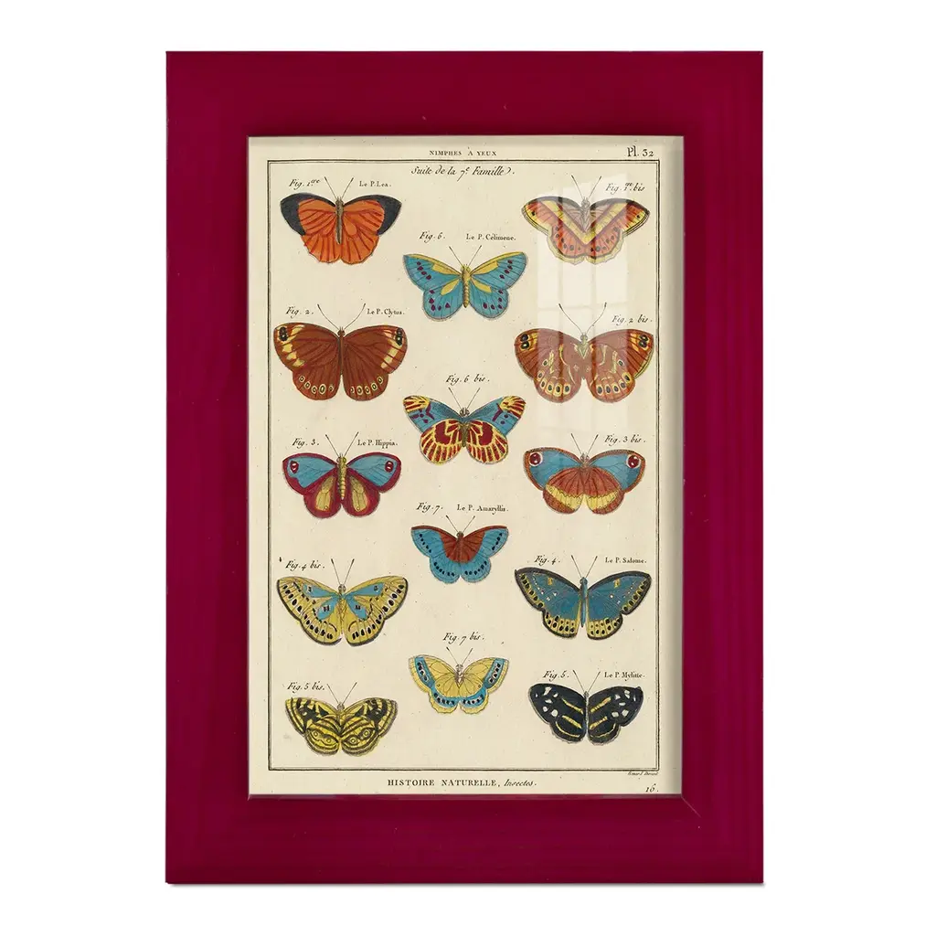 Histoire Naturelle Butterflies I -EZ SWITCH Framed Print w/glass-Cherry Red A delightful, framed print. Featuring a solid wood frame with real wood glass. This premium print is giclee quality. In addition, every frame features a removable back and table top stand. This allows you to change your art in the future or to just stand the art on a table for a new look. We are sure you'll enjoy our new series of EZ SWITCH Framed Art. Solid Wood Frame Real Glass Removable / Replaceable Art Built in Tabletop Stand Sizes range from 4x6 up to 12x15 - buy just one or pair them up as sets as you see fit.