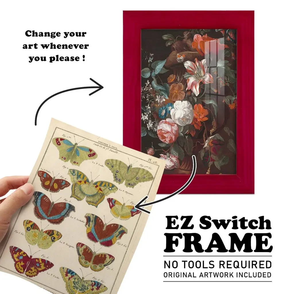 Histoire Naturelle Butterflies V -EZ SWITCH Framed Print w/glass-Cherry Red A delightful, framed print. Featuring a solid wood frame with real wood glass. This premium print is giclee quality. In addition, every frame features a removable back and table top stand. This allows you to change your art in the future or to just stand the art on a table for a new look. We are sure you'll enjoy our new series of EZ SWITCH Framed Art. Solid Wood Frame Real Glass Removable / Replaceable Art Built in Tabletop Stand Sizes range from 4x6 up to 12x15 - buy just one or pair them up as sets as you see fit.