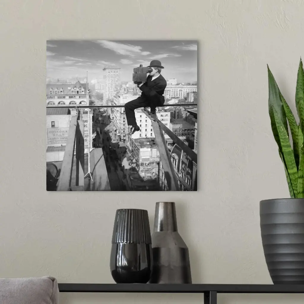 Historic image in black and white of a photographer sitting on a slender girder above fifth avenue in New York City with a stereocamera, circa 1905; New York City, New York, United States of America