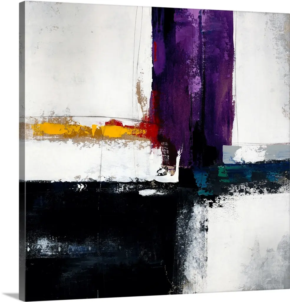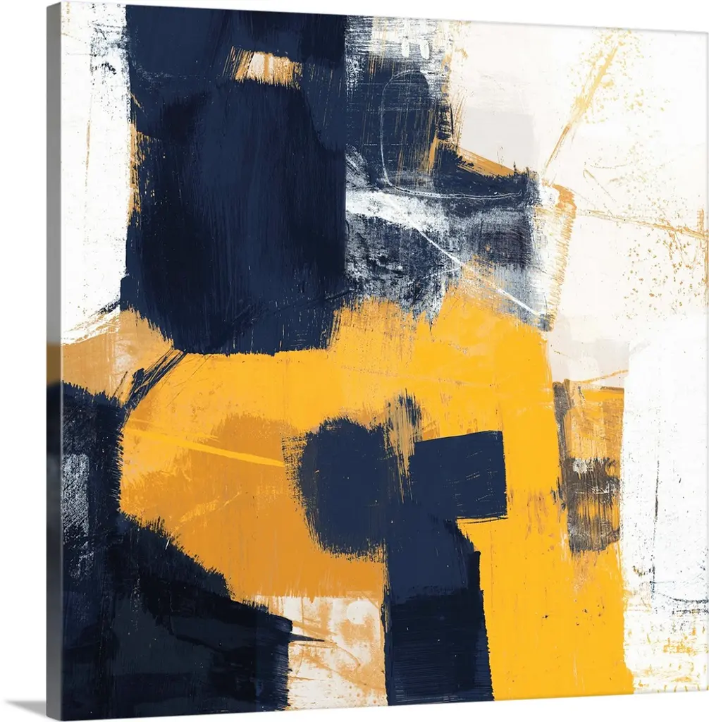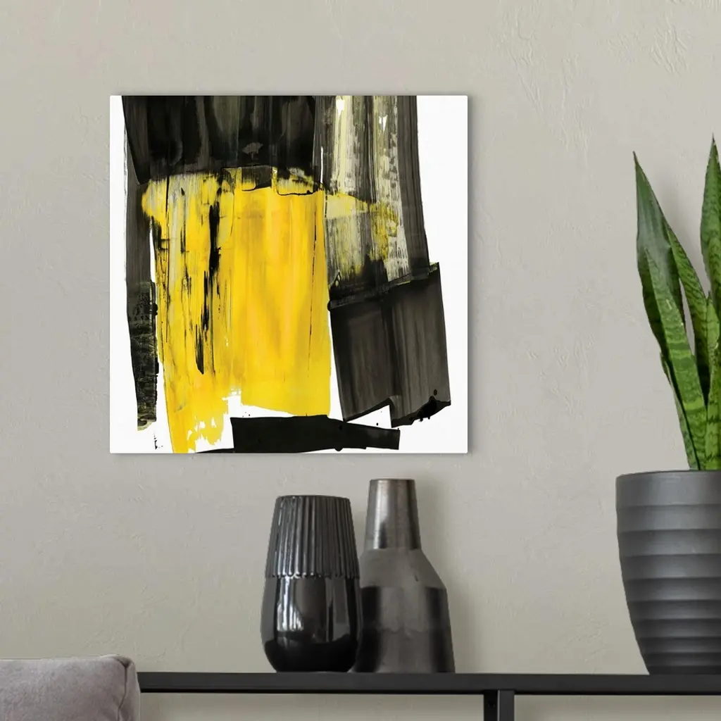 Contemporary abstract artwork in black and grey with a pop of bright yellow.