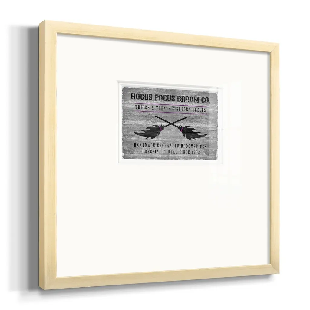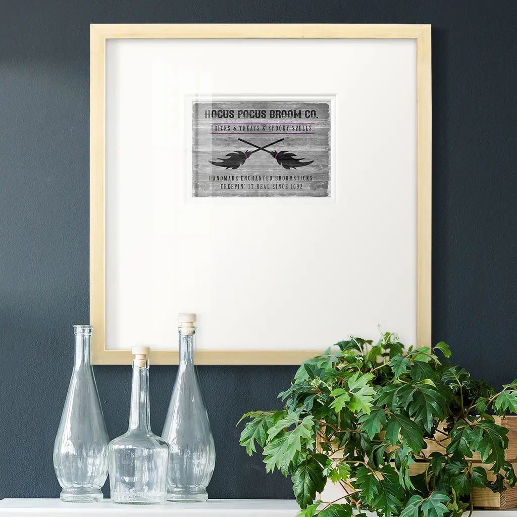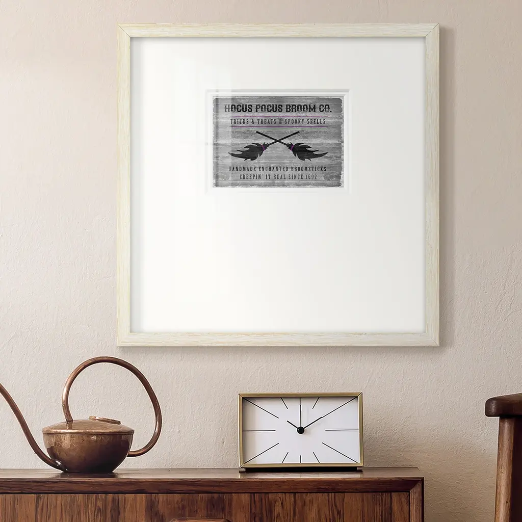 Hocus Pocus Broom CoPremium Framed Print A framed cold pressed paper print featuring superior double matting and quality frame. 2 SIZES AVAILABLE 16''X16''' - Overall Size 20''X20''' - Overall Size Each piece is made to order. Each piece comes with hanging hardware. Made in the USA Ready to Hang Giclee Paper Print Plexiglass Beveled Matt Board Double Matte Board