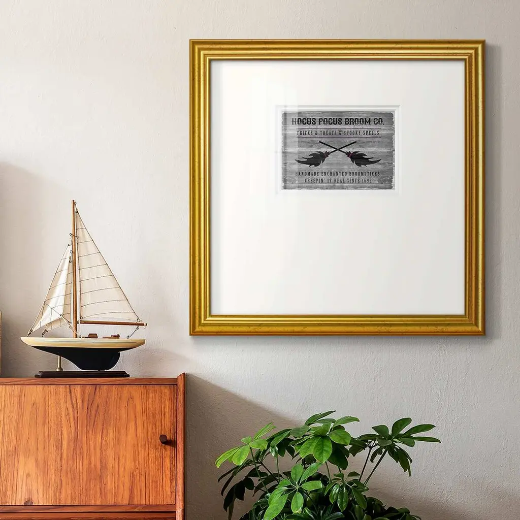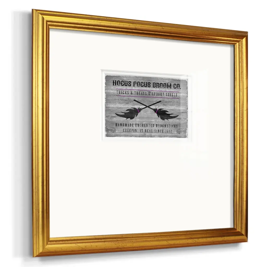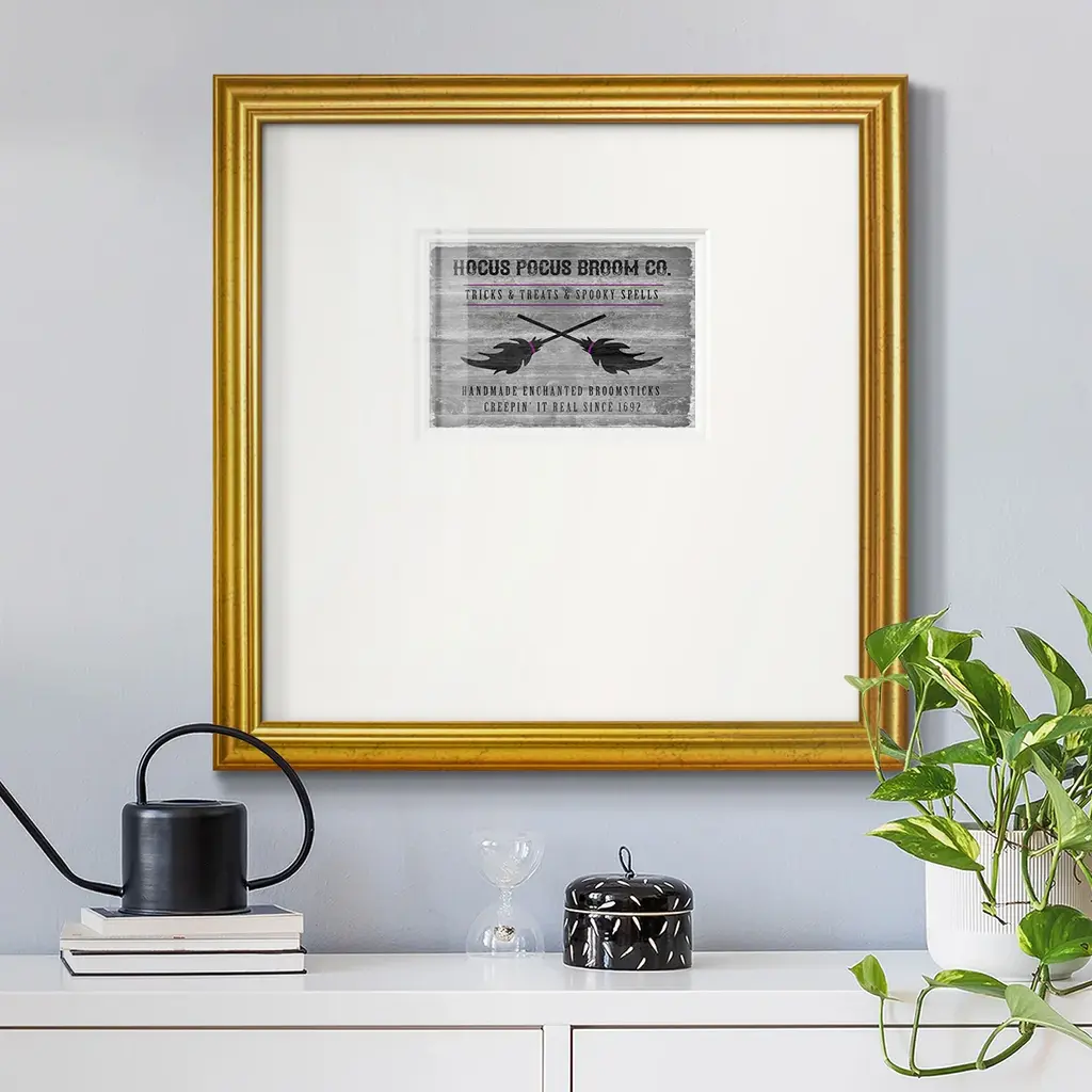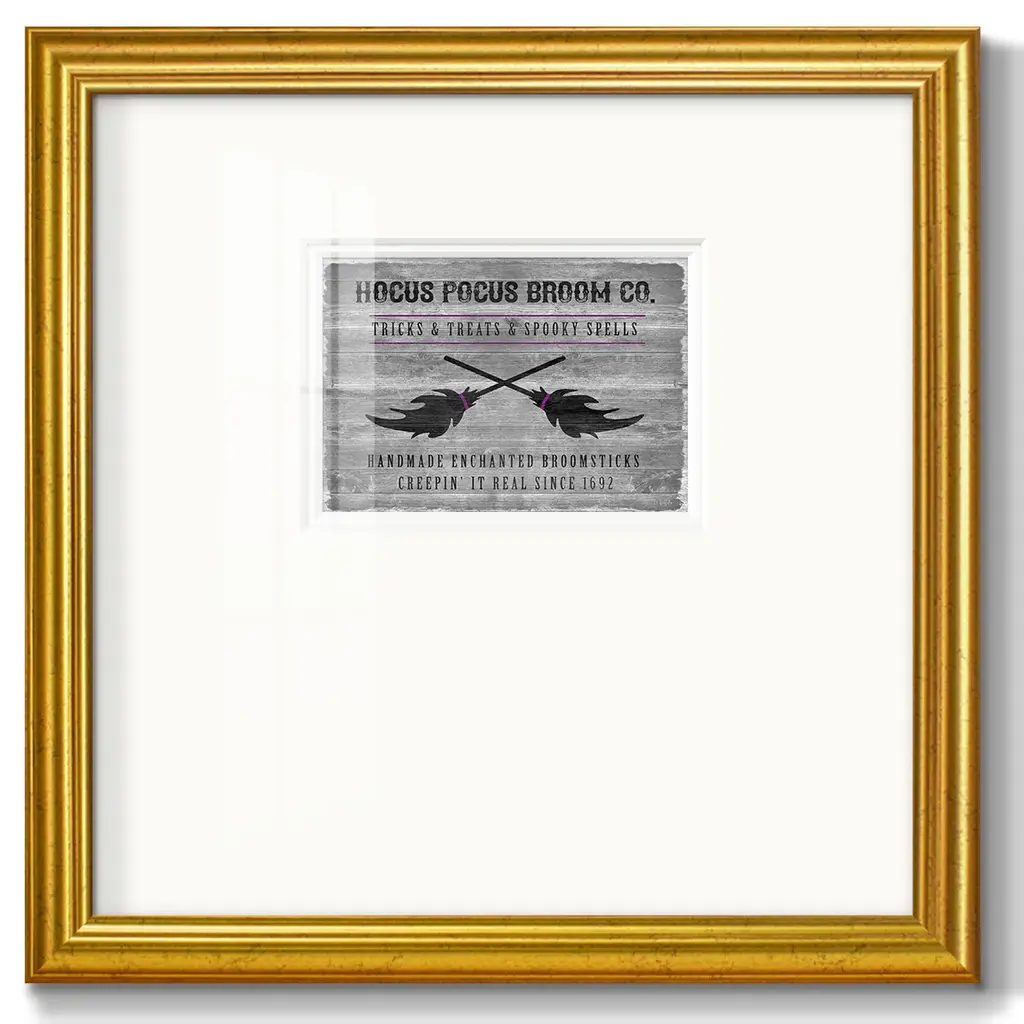 Hocus Pocus Broom CoPremium Framed Print A framed cold pressed paper print featuring superior double matting and quality frame. 2 SIZES AVAILABLE 16''X16''' - Overall Size 20''X20''' - Overall Size Each piece is made to order. Each piece comes with hanging hardware. Made in the USA Ready to Hang Giclee Paper Print Plexiglass Beveled Matt Board Double Matte Board