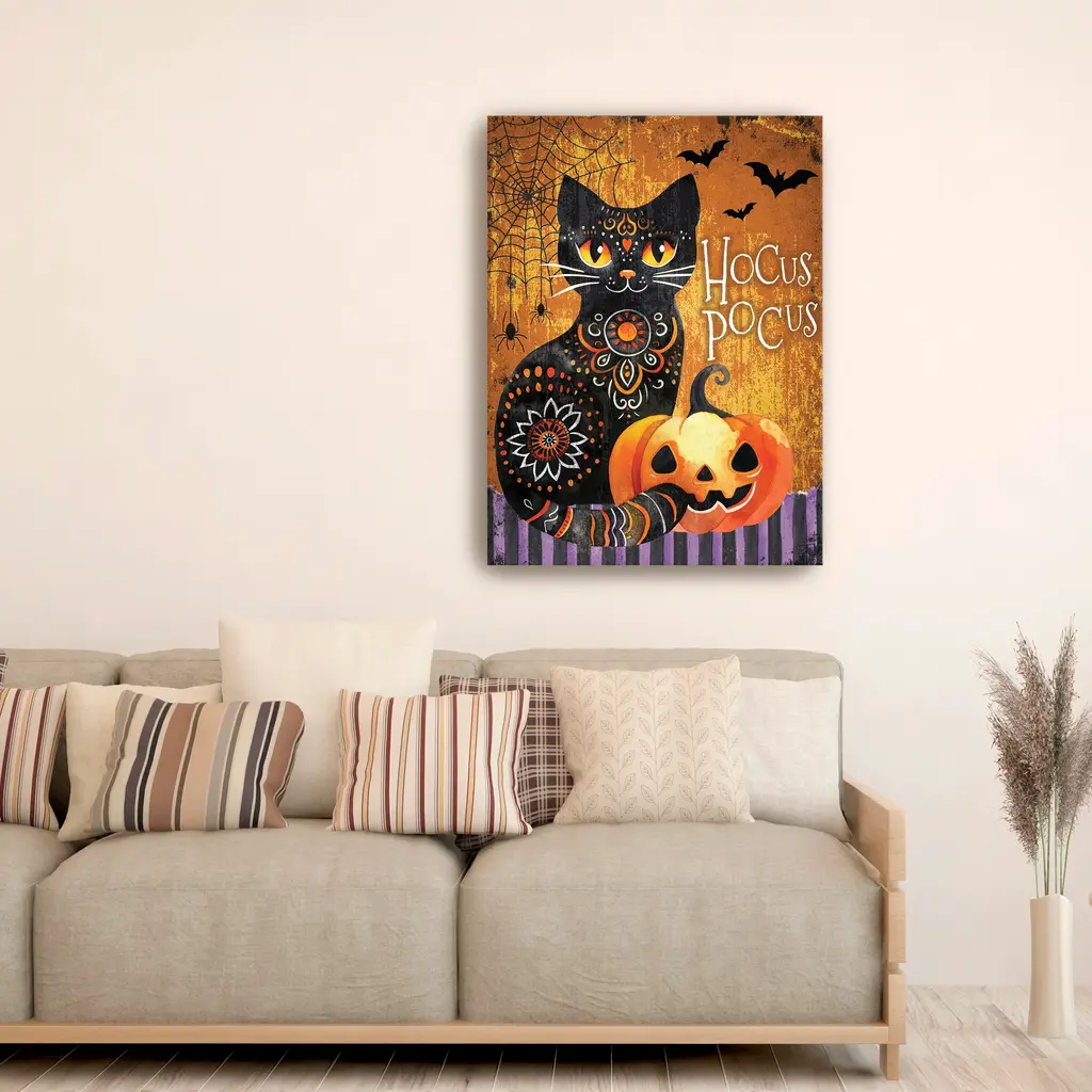 With its curious gaze and flickering companion, this Halloween cat evokes mystery and autumn magic. It's a classic scene where feline charm meets festive fright. Our Gallery Wrap Canvas Prints are proudly assembled with high quality materials in California, USA. Each piece is printed on a thick, archival grade canvas using Giclee technology. It is then hand-stretched by our experienced artisans over solid wood bars, which will not warp over time. The final product is a piece personally crafted for you to confidently display on your wall. Care and Assembly: Ensure that the location of your piece has little to no exposure to heat, sunlight, and moisture. Wipe clean, only if needed. Each piece includes a sawtooth hanger to hang on your wall vertically.