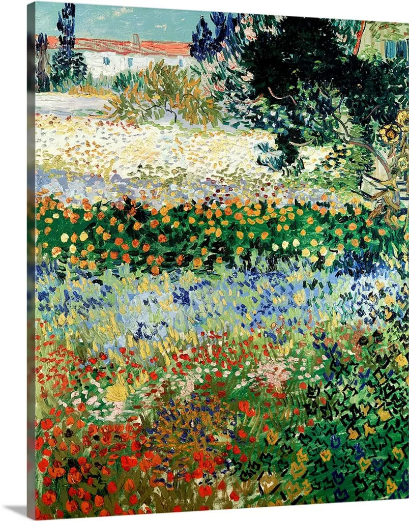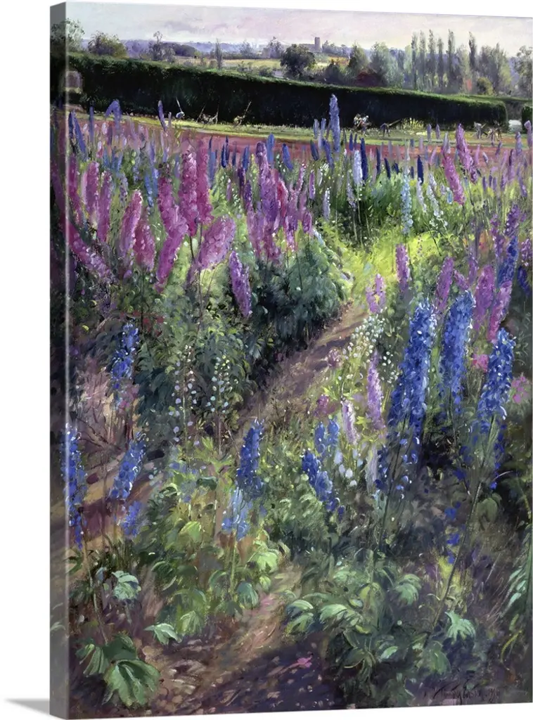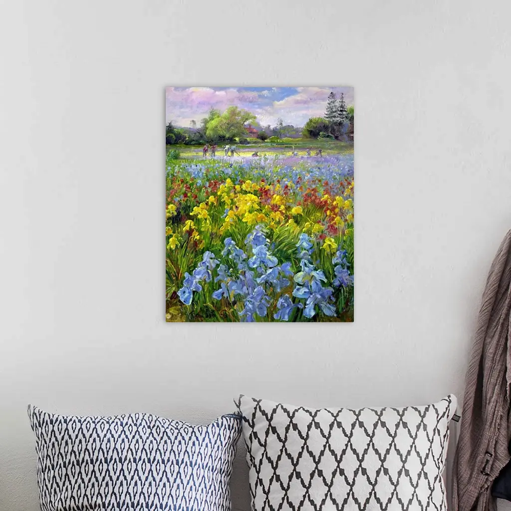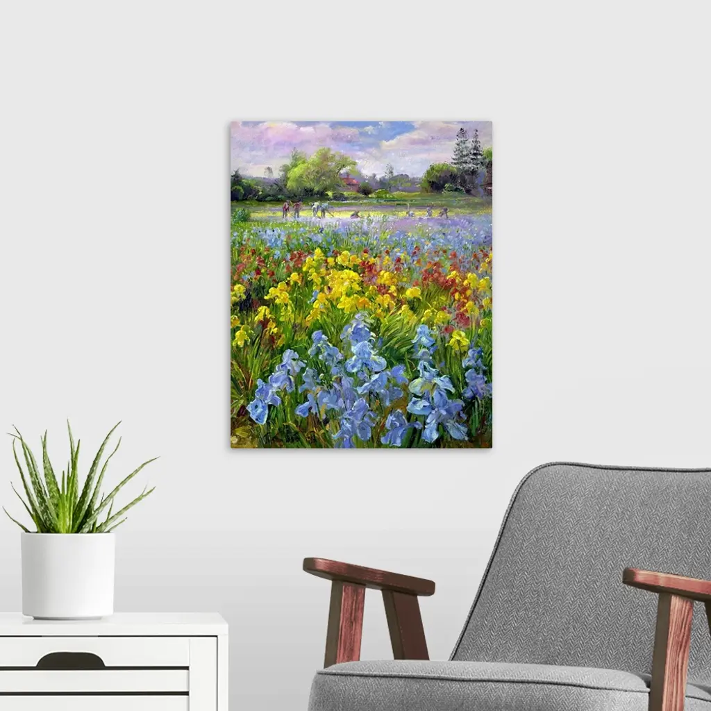 Vertical, oversized floral painting of a field of multicolored irises, a large group of people in the distant background are working and hoeing in a garden.