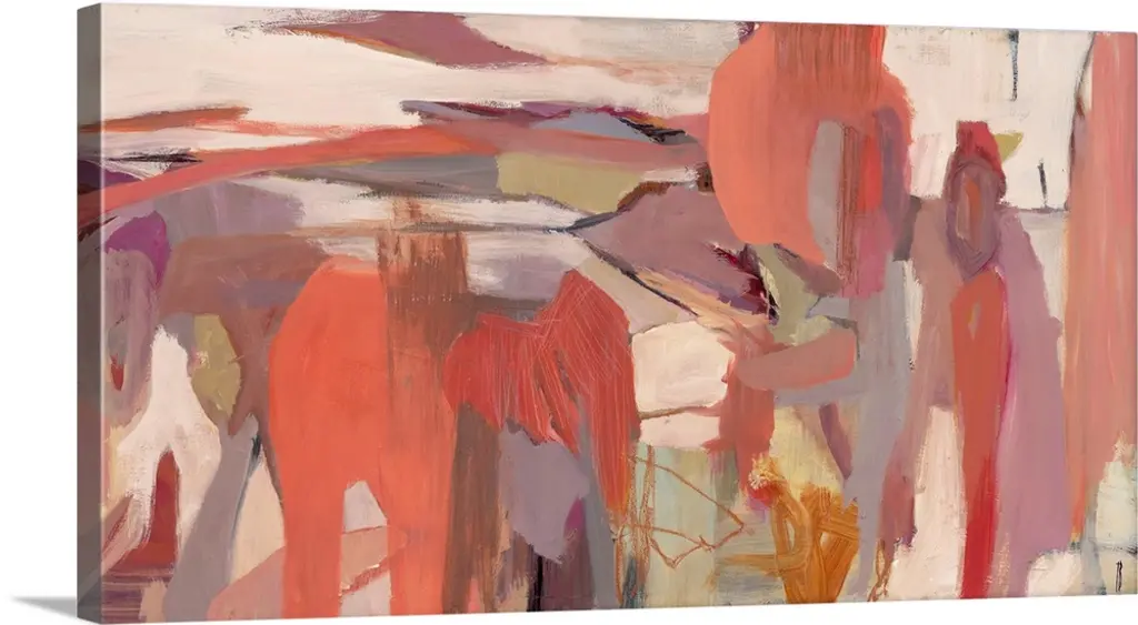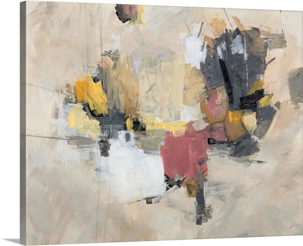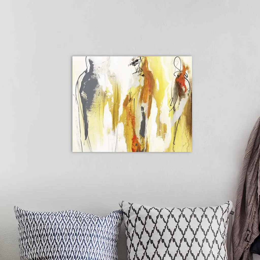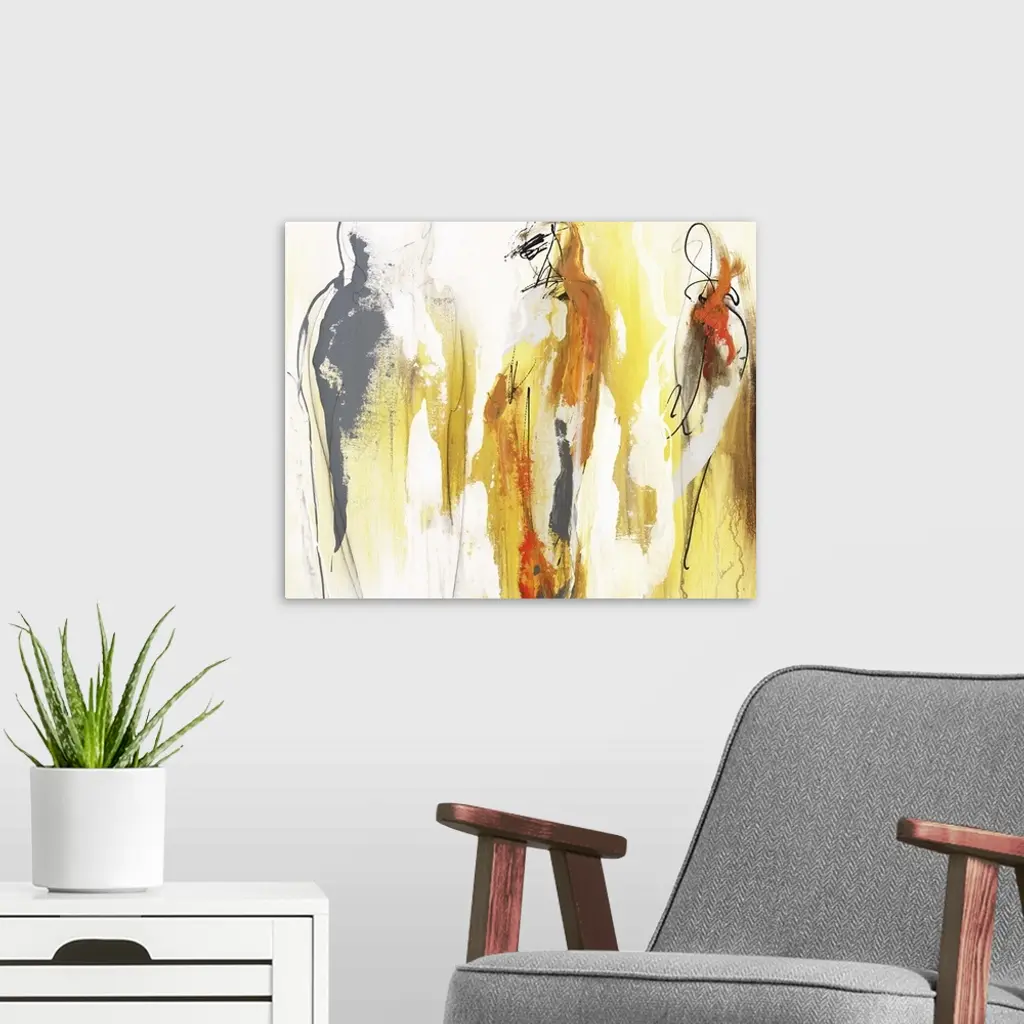 Figurative abstract painting in warm yellow, orange, gray, and brown hues.