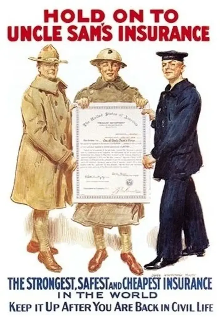 James Montgomery Flagg (1877 - 1960) was an American artist and illustrator. He is most famous for his war effort posters but he also work for magazines, did cartoons, and even paintings. One of the rarest of Flagg's WWI posters, this encourages returning military men to keep the military insurance after their service ends showing a sailor and soldiers holding up a large insurance certificate.