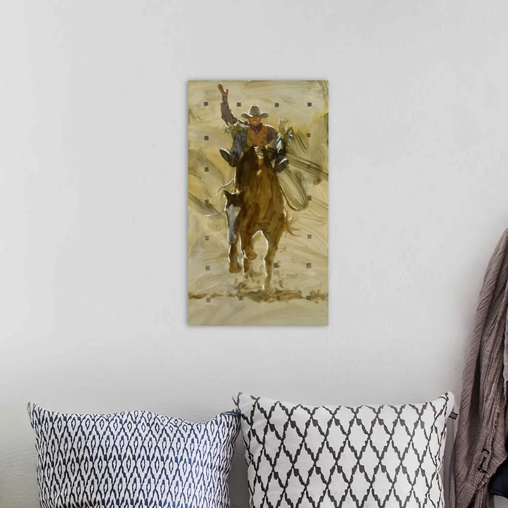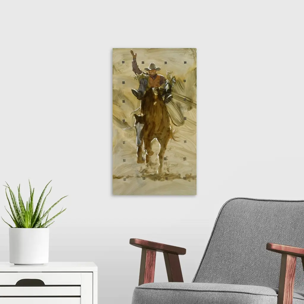 Contemporary western theme painting of a cowboy riding a bucking bronco.