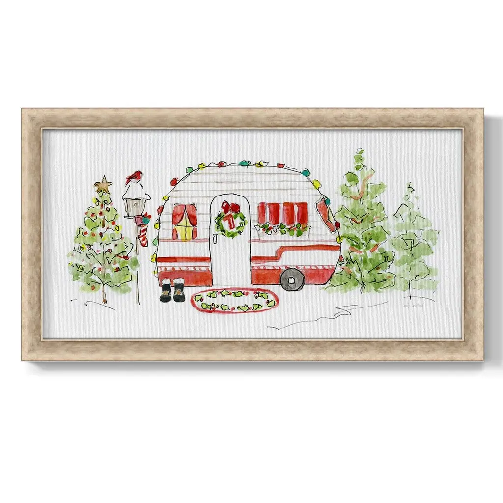 Holiday Camper I Premium Framed Canvas- Ready to Hang A Premium Framed Canvas created to last. Framed in distressed wood and available in an array of sizes and colors Featuring a beveled a solid wood stretcher bar, each piece comes ready to hand 3 SIZES AVAILABLE 21''X37'' - Overall Size 25''X45'' - Overall Size 29''x53'' - Overall Size Each piece is made to order. Each piece comes with hanging hardware. Made in the USA Ready to Hang Giclee Paper Print Acrylic Glass Beveled Matt Board