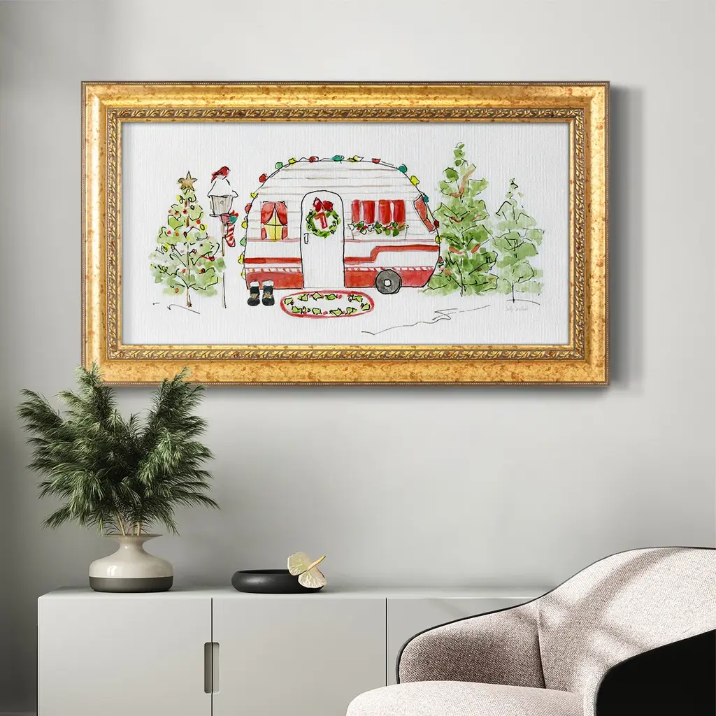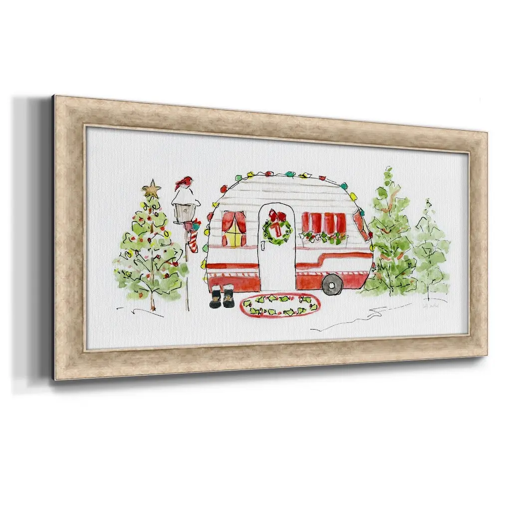 Holiday Camper I Premium Framed Canvas- Ready to Hang A Premium Framed Canvas created to last. Framed in distressed wood and available in an array of sizes and colors Featuring a beveled a solid wood stretcher bar, each piece comes ready to hand 3 SIZES AVAILABLE 21''X37'' - Overall Size 25''X45'' - Overall Size 29''x53'' - Overall Size Each piece is made to order. Each piece comes with hanging hardware. Made in the USA Ready to Hang Giclee Paper Print Acrylic Glass Beveled Matt Board