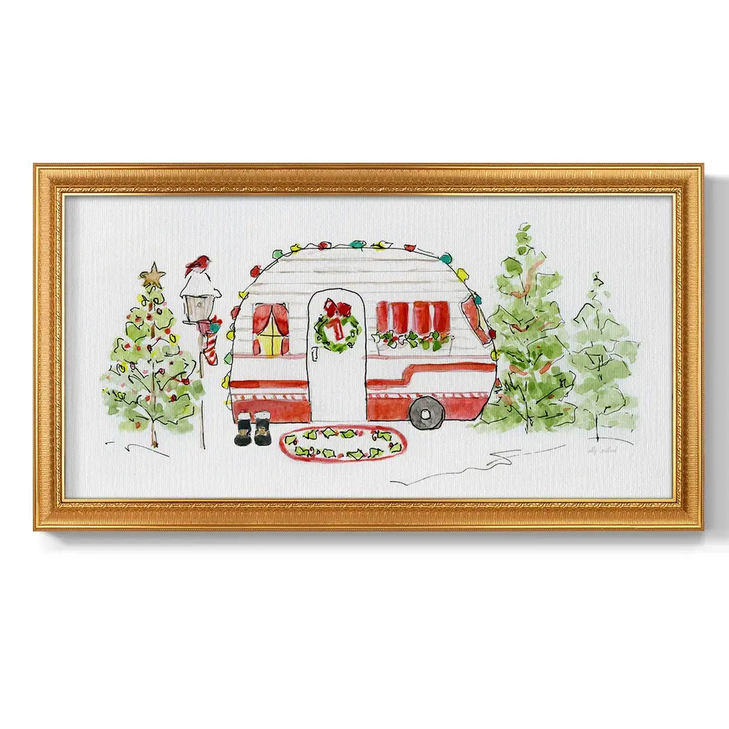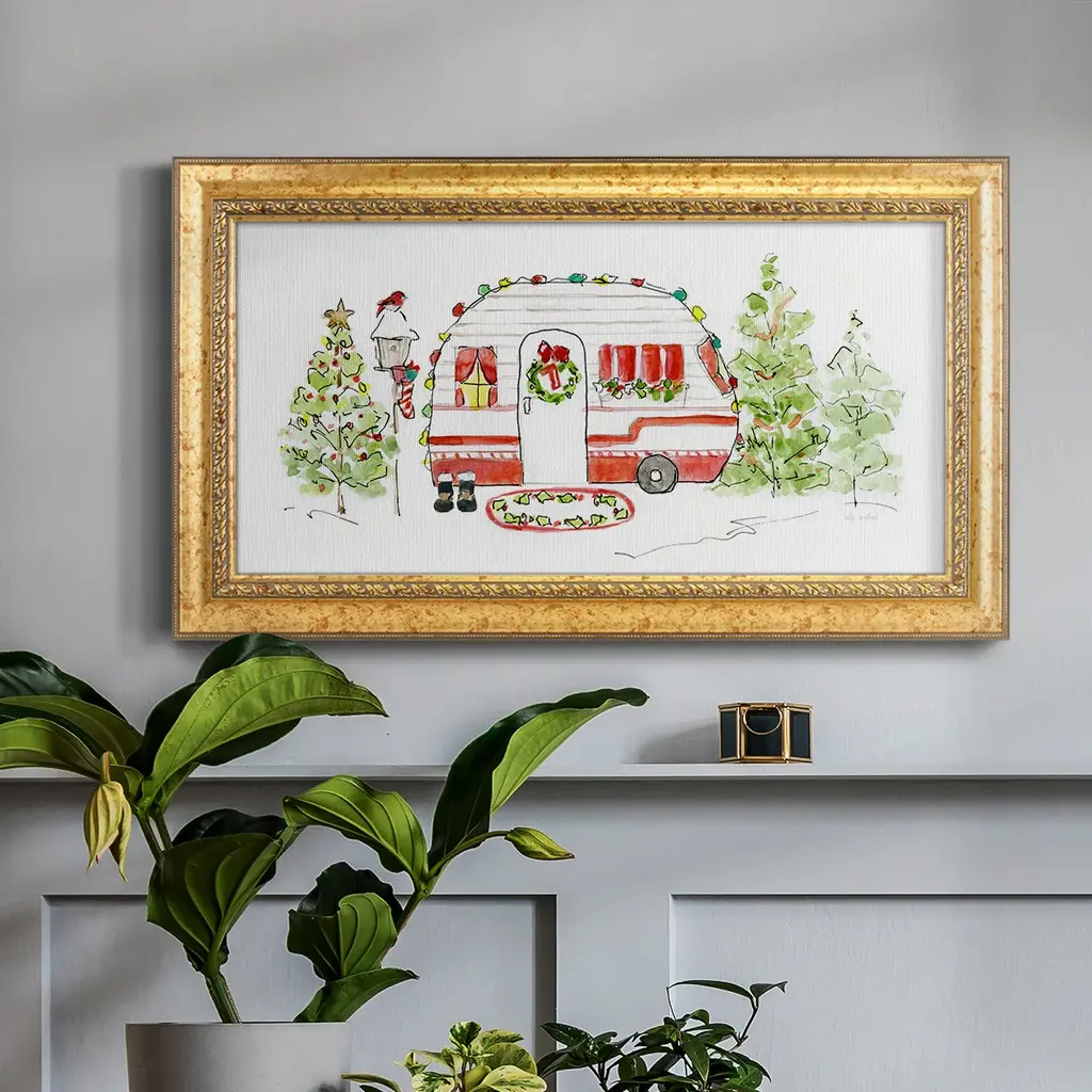 Holiday Camper I Premium Framed Canvas- Ready to Hang A Premium Framed Canvas created to last. Framed in distressed wood and available in an array of sizes and colors Featuring a beveled a solid wood stretcher bar, each piece comes ready to hand 3 SIZES AVAILABLE 21''X37'' - Overall Size 25''X45'' - Overall Size 29''x53'' - Overall Size Each piece is made to order. Each piece comes with hanging hardware. Made in the USA Ready to Hang Giclee Paper Print Acrylic Glass Beveled Matt Board