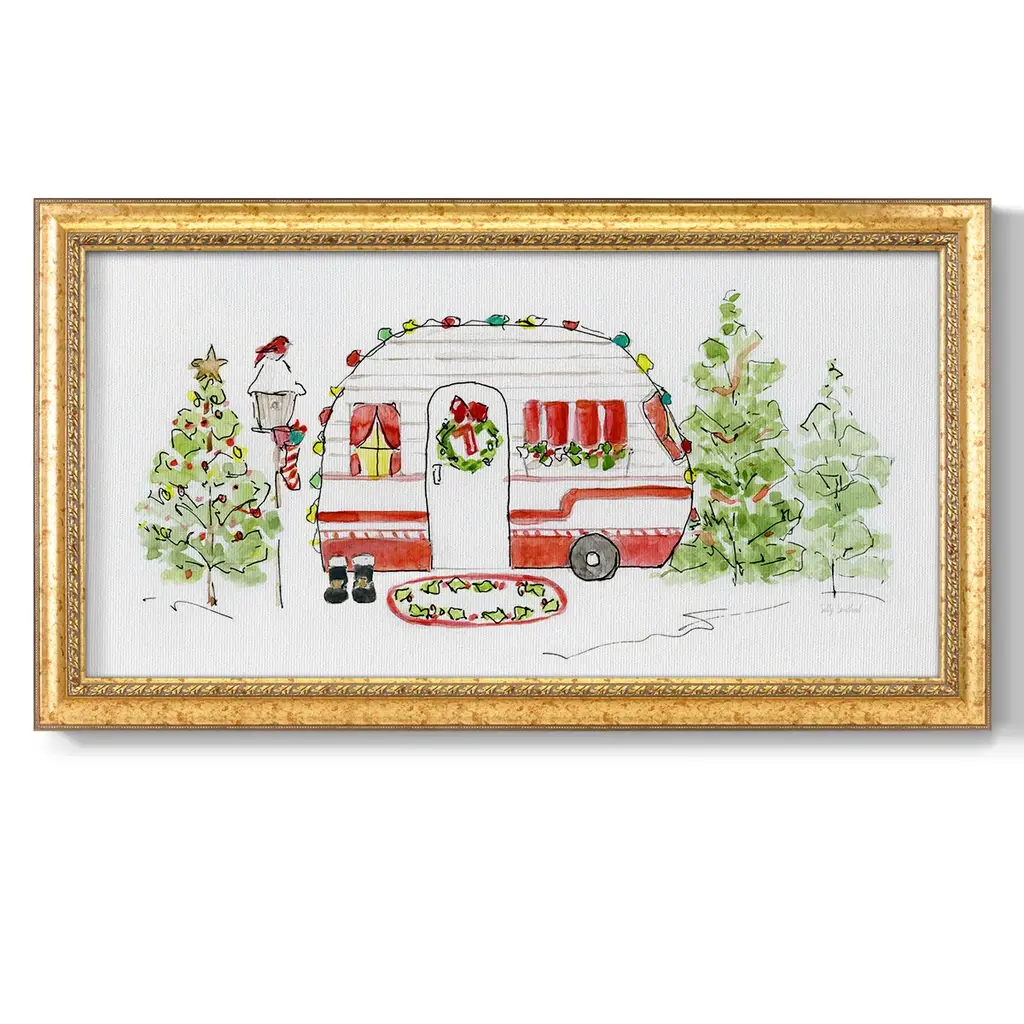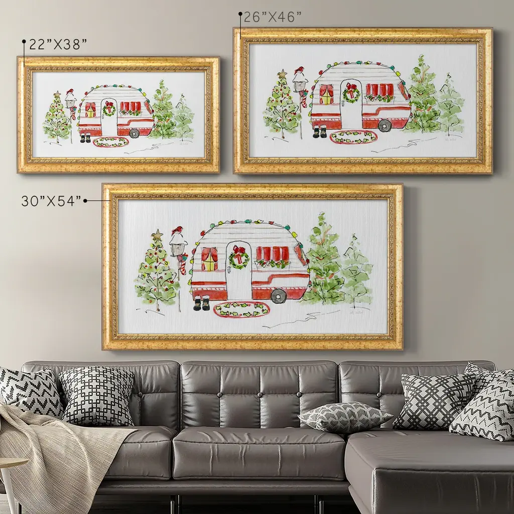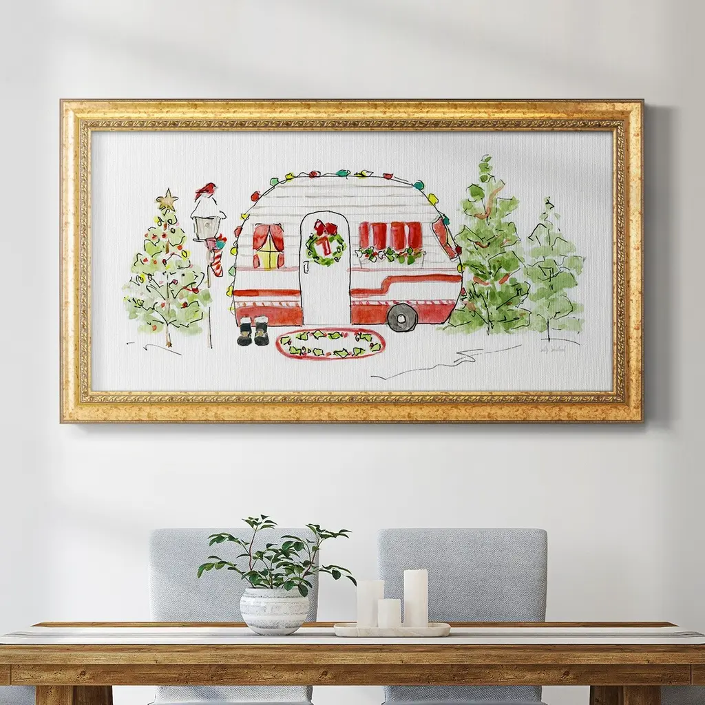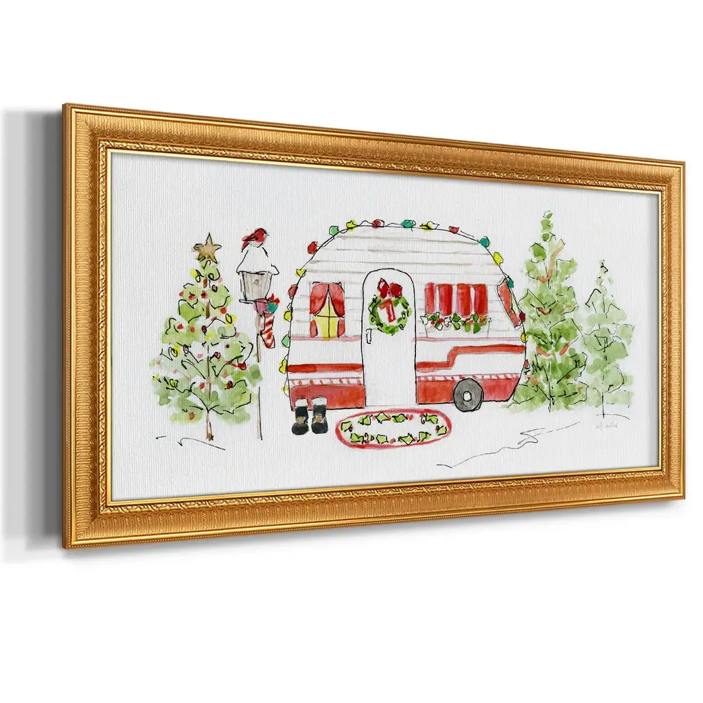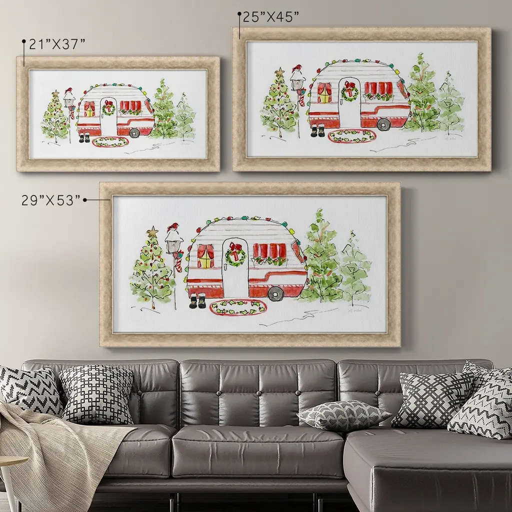 Holiday Camper I Premium Framed Canvas- Ready to Hang A Premium Framed Canvas created to last. Framed in distressed wood and available in an array of sizes and colors Featuring a beveled a solid wood stretcher bar, each piece comes ready to hand 3 SIZES AVAILABLE 21''X37'' - Overall Size 25''X45'' - Overall Size 29''x53'' - Overall Size Each piece is made to order. Each piece comes with hanging hardware. Made in the USA Ready to Hang Giclee Paper Print Acrylic Glass Beveled Matt Board