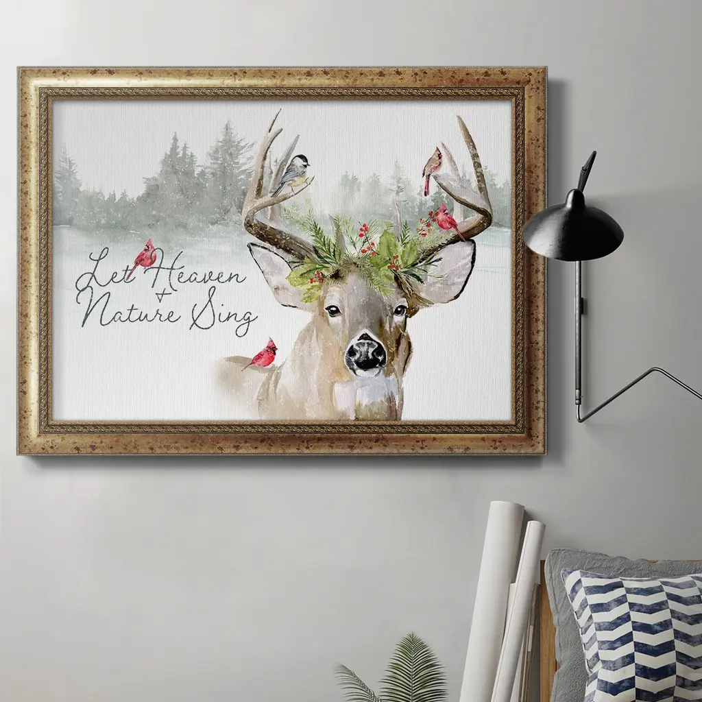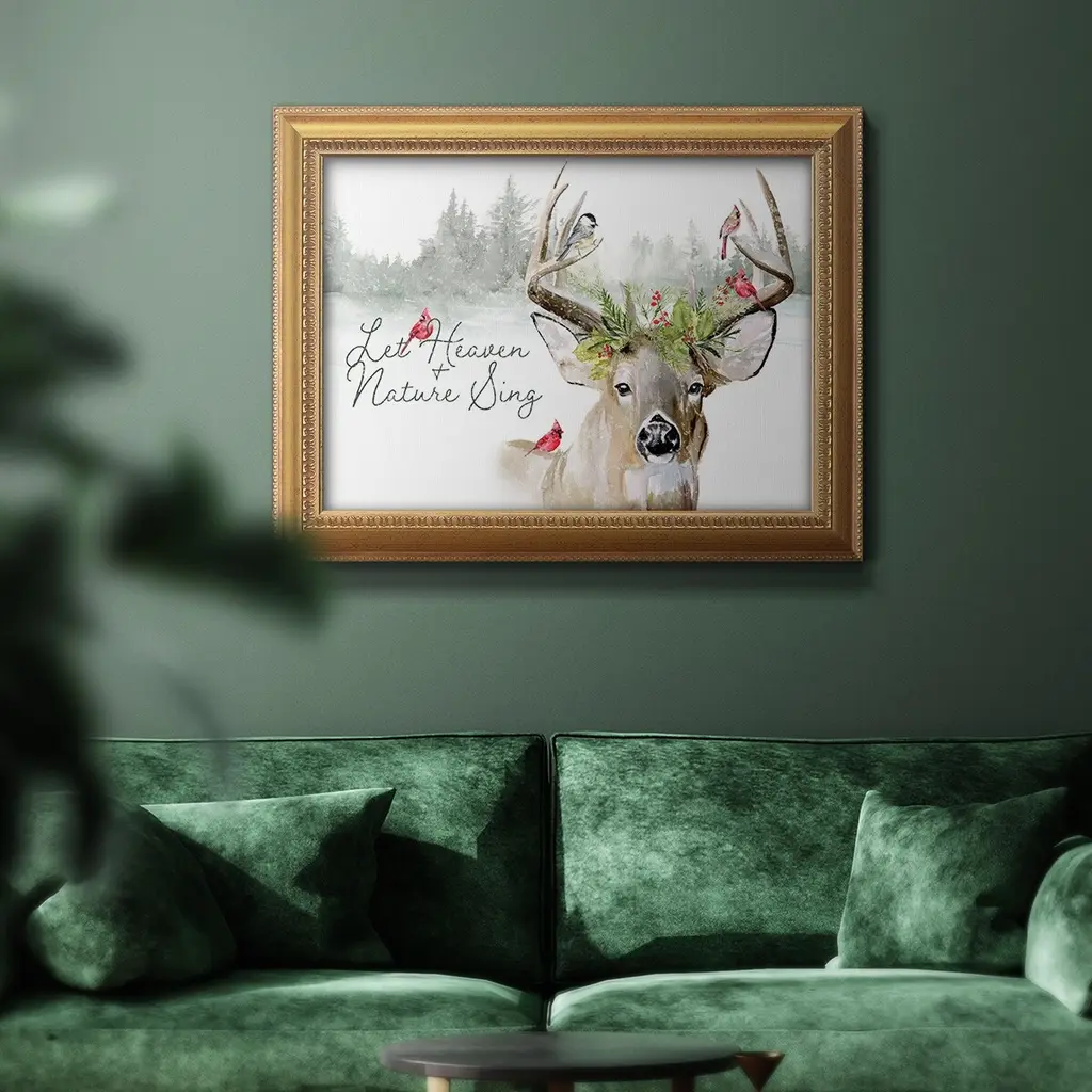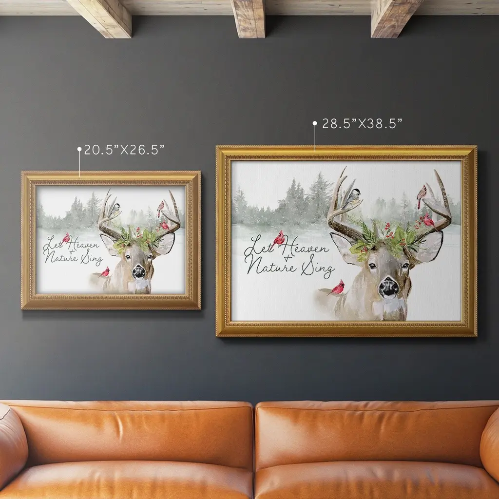 Holiday Deer Collection A Premium Framed Canvas- Ready to Hang A Premium Framed Canvas created to last. Framed in distressed wood and available in an array of sizes and colors Featuring a beveled a solid wood stretcher bar, each piece comes ready to hand 3 SIZES AVAILABLE 16''X20'' - Overall Size 18'X27'' - Overall Size 24''x36'' - Overall Size Each piece is made to order. Each piece comes with hanging hardware. Made in the USA Ready to Hang Giclee Paper Print Acrylic Glass Beveled Matt Board