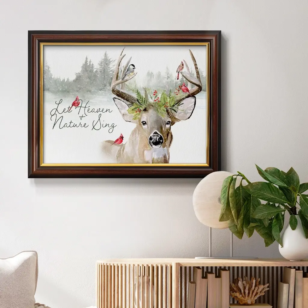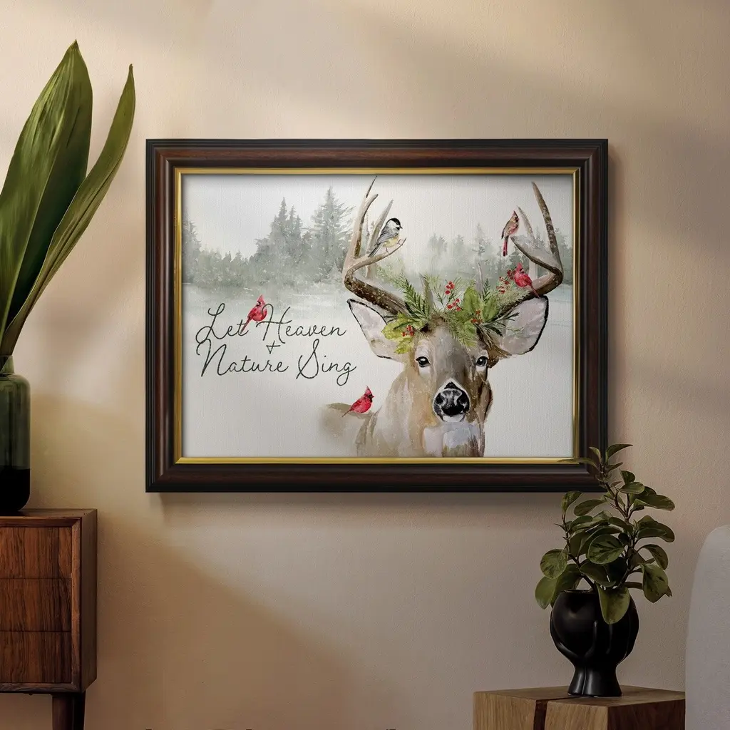Holiday Deer Collection A Premium Framed Canvas- Ready to Hang A Premium Framed Canvas created to last. Framed in distressed wood and available in an array of sizes and colors Featuring a beveled a solid wood stretcher bar, each piece comes ready to hand 3 SIZES AVAILABLE 16''X20'' - Overall Size 18'X27'' - Overall Size 24''x36'' - Overall Size Each piece is made to order. Each piece comes with hanging hardware. Made in the USA Ready to Hang Giclee Paper Print Acrylic Glass Beveled Matt Board