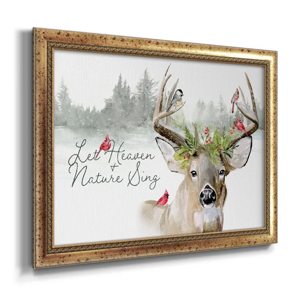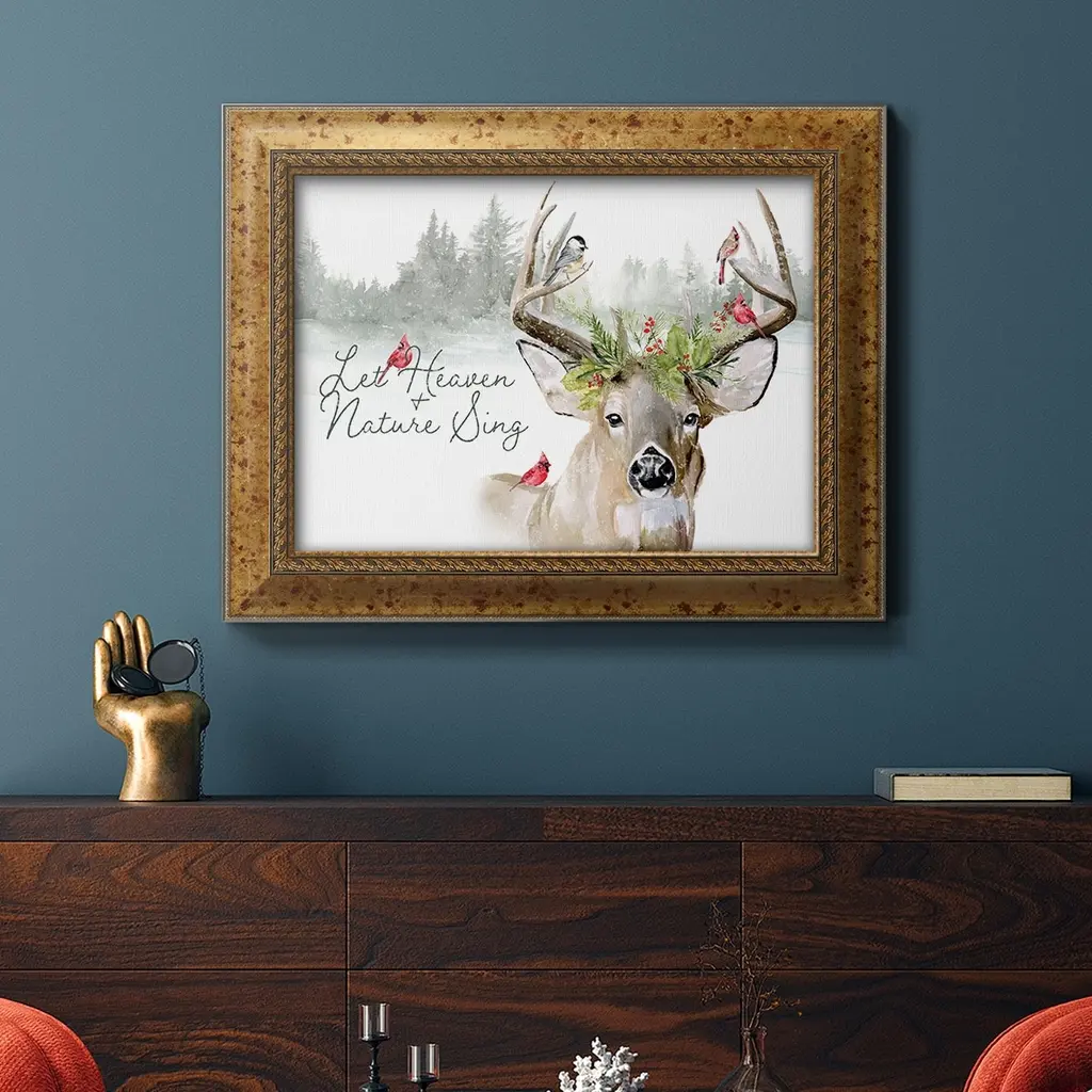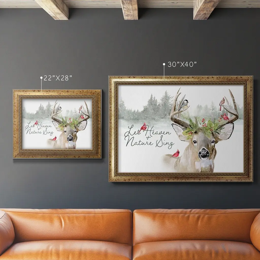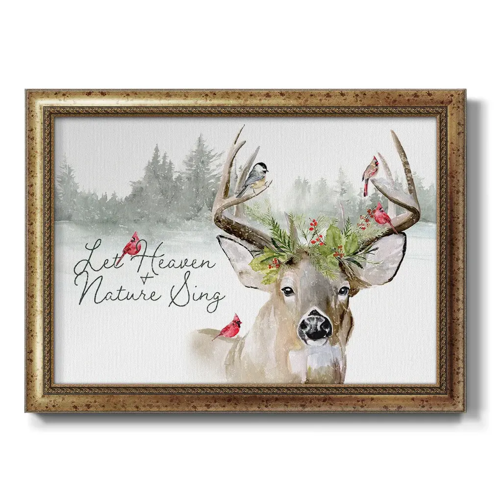 Holiday Deer Collection A Premium Framed Canvas- Ready to Hang A Premium Framed Canvas created to last. Framed in distressed wood and available in an array of sizes and colors Featuring a beveled a solid wood stretcher bar, each piece comes ready to hand 3 SIZES AVAILABLE 16''X20'' - Overall Size 18'X27'' - Overall Size 24''x36'' - Overall Size Each piece is made to order. Each piece comes with hanging hardware. Made in the USA Ready to Hang Giclee Paper Print Acrylic Glass Beveled Matt Board