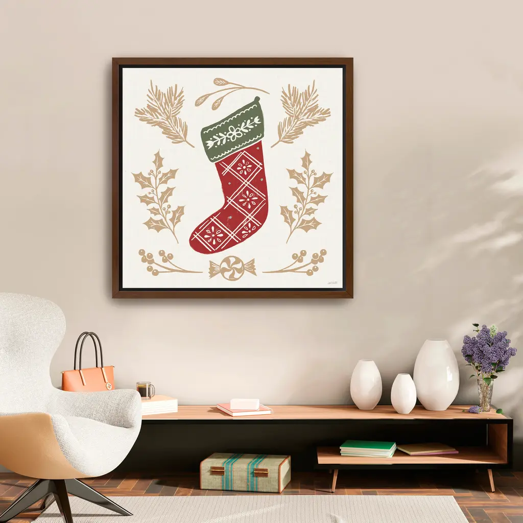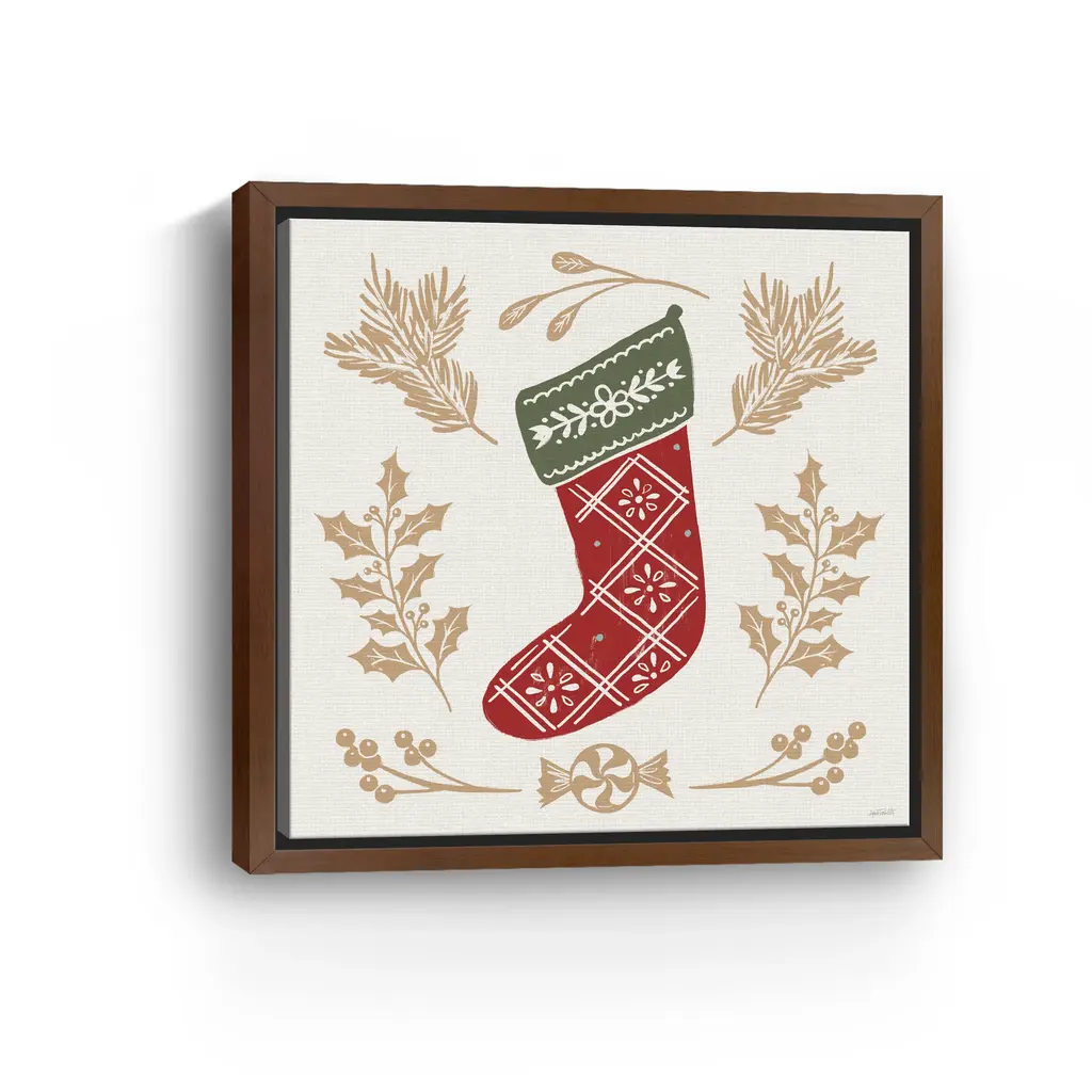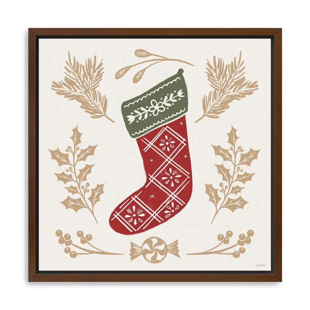 Celebrate the warmth of the season with this festive canvas print featuring a red Christmas stocking surrounded by holiday foliage and peppermint accents. Its bold design and cozy details create a joyful focal point for your holiday decor. Our Gallery Wrap Canvas Prints are proudly assembled with high quality materials in California, USA. Each piece is printed on a thick, archival grade canvas using Giclee technology. It is then hand-stretched by our experienced artisans over solid wood bars, which will not warp over time. The final product is a piece personally crafted for you to confidently display on your wall. Care and Assembly: Ensure that the location of your piece has little to no exposure to heat, sunlight, and moisture. Wipe clean, only if needed. Each piece includes hanging hardware to hang on your wall horizontally.