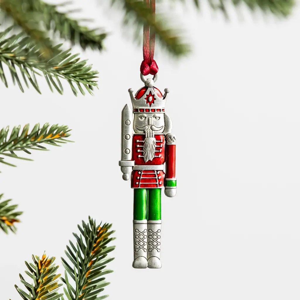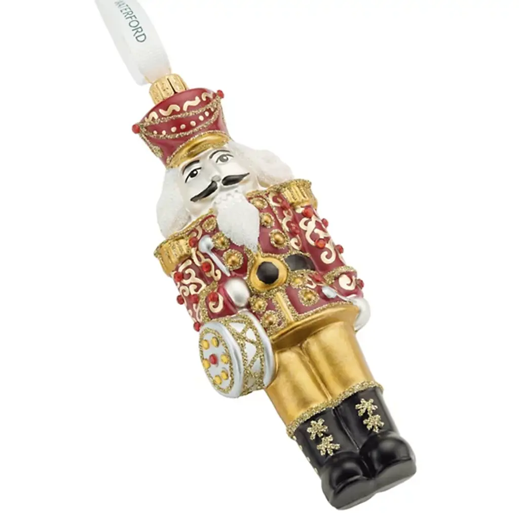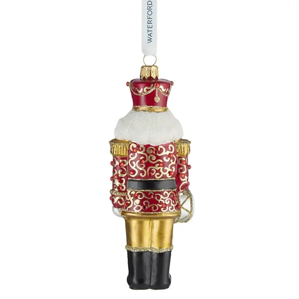The Holiday Heirlooms Nutcracker Ornament from Waterford brings the stately nutcracker character to life through dimensional glass construction and intricate detailing. European artisans handcraft each piece, applying hand-painted embellishments that define the nutcracker's uniform, facial features, and ceremonial accessories. The ornament captures the regal bearing of traditional nutcracker figures through careful attention to proportional details and decorative elements. Each piece receives individual painting and embellishment work, while maintaining the recognizable nutcracker form that connects to beloved holiday traditions.