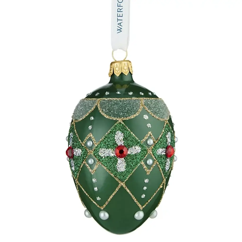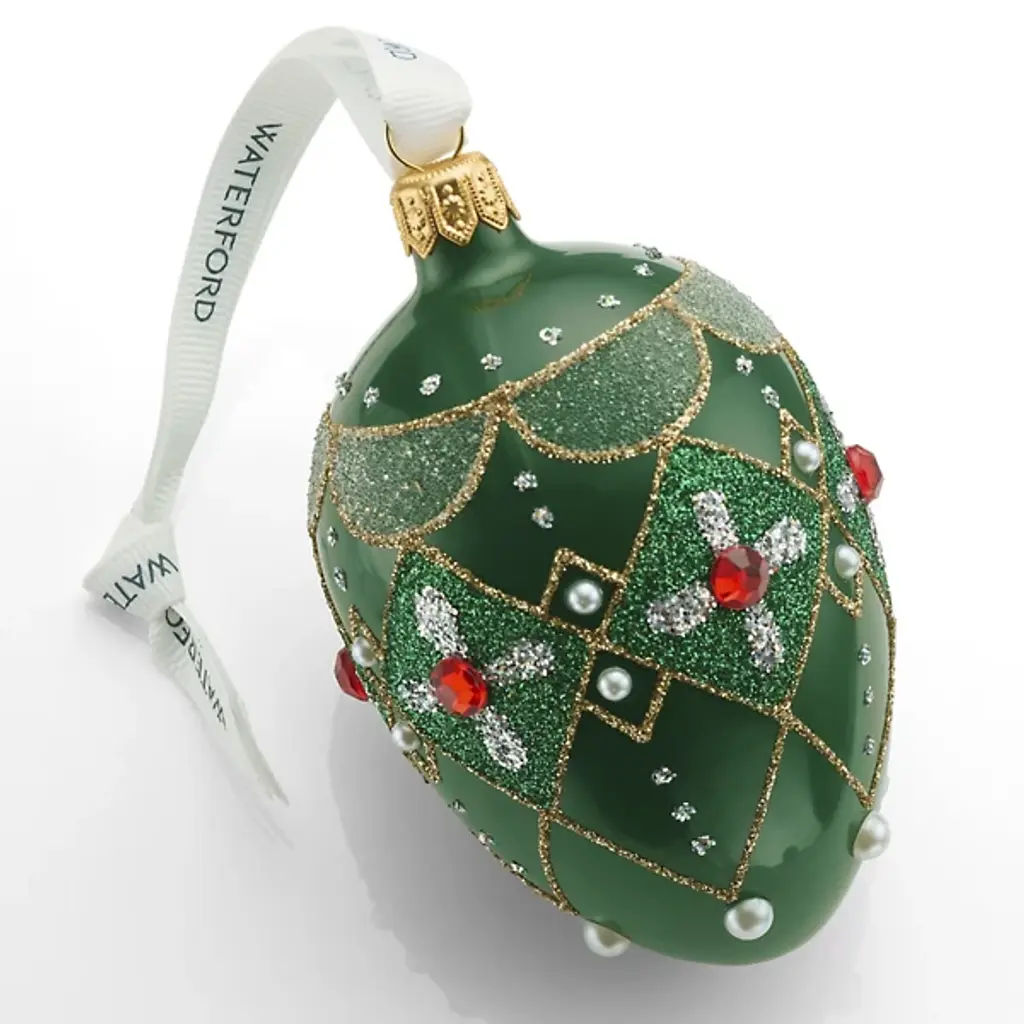 The Holiday Heirlooms Oval Bauble from Waterford uses an elongated oval shape instead of traditional spherical construction. European artisans handcraft each piece, applying intricate glitter detailing across the curved surface. Jewel-like embellishments accent the glittered elements, adding dimensional texture that catches light. The oval form creates a visual distinction from standard round baubles. It provides additional surface area for decorative application. Each ornament receives individual hand-painting and embellishment work. This ensures unique variations in the final decorative arrangement across the elongated surface.
