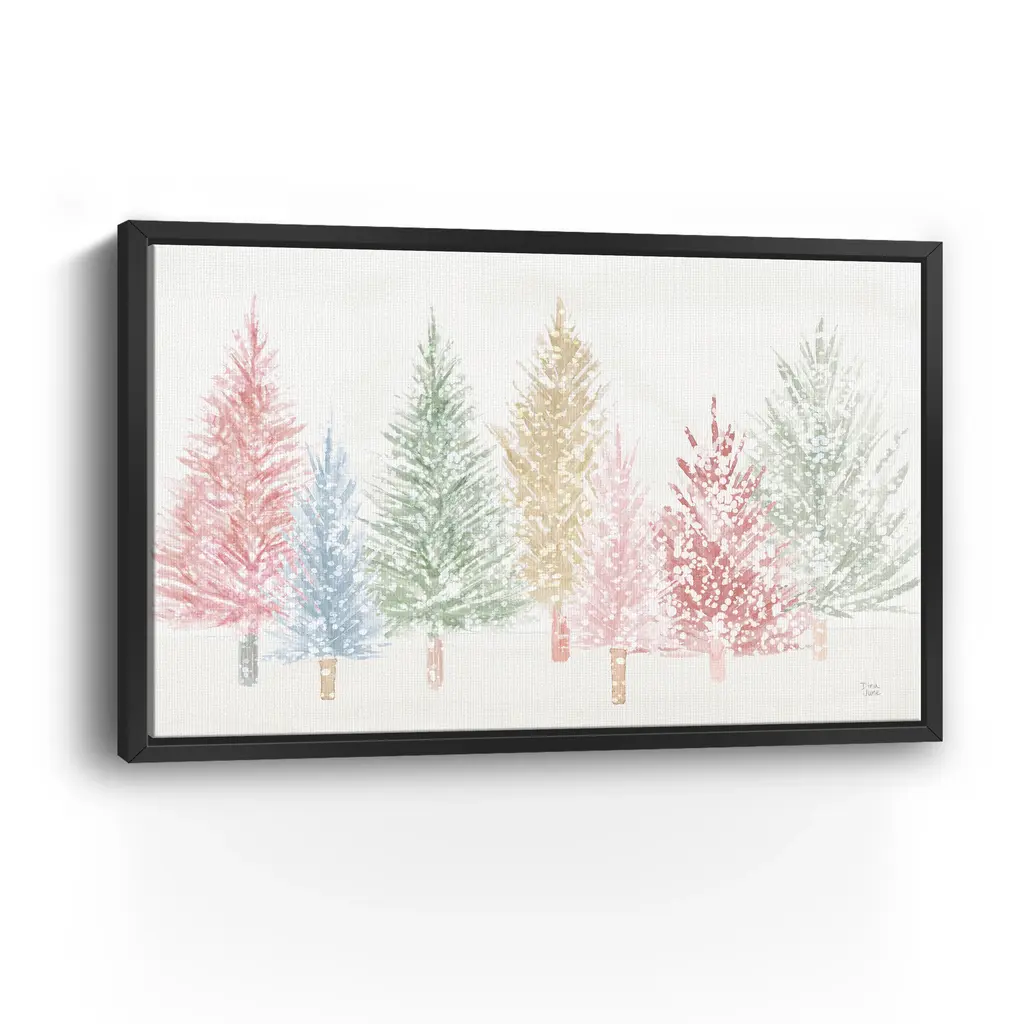 Celebrate the beauty of winter with this vibrant canvas print featuring a row of colorful conifer trees against a snowy backdrop. The fine line textures and soft palette create a peaceful, modern accent for seasonal decorating. Our Gallery Wrap Canvas Prints are proudly assembled with high quality materials in California, USA. Each piece is printed on a thick, archival grade canvas using Giclee technology. It is then hand-stretched by our experienced artisans over solid wood bars, which will not warp over time. The final product is a piece personally crafted for you to confidently display on your wall. Care and Assembly: Ensure that the location of your piece has little to no exposure to heat, sunlight, and moisture. Wipe clean, only if needed. Each piece includes hanging hardware to hang on your wall horizontally.