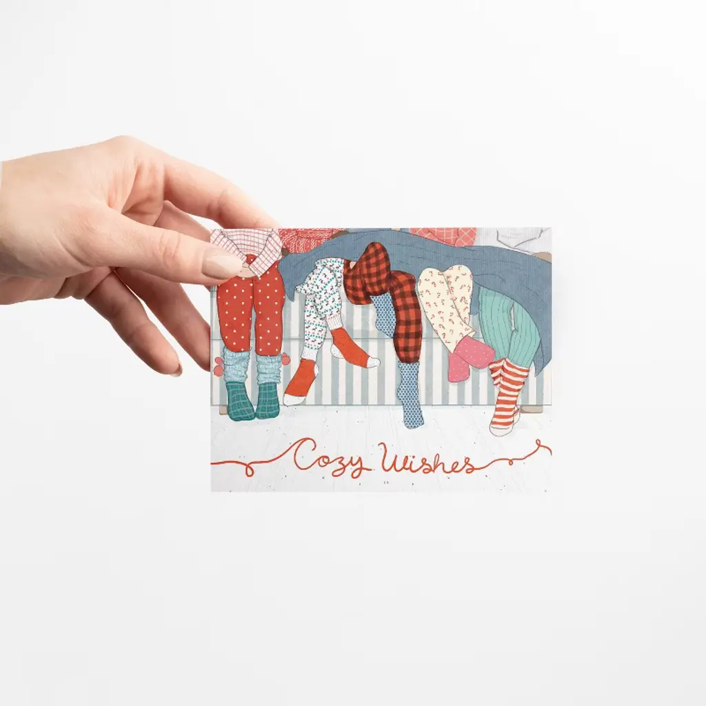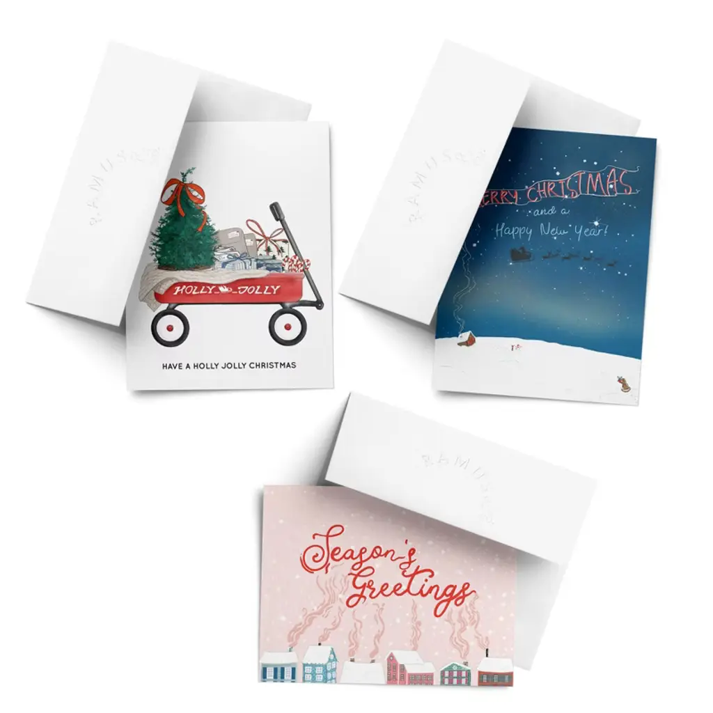 This 3-pack of assorted winter/holiday greeting cards is elegantly illustrated by artist Ingrid Ramus, founder and owner of the Ramus & Co brand. Card 1 front artwork: Holiday yeti mailing letters (no text), Blank inside. Card 2 artwork: "Cozy wishes" with holiday pajamas, Blank inside. Card 3 artwork: Assorted winter accessories, Blank inside. All greeting cards are made in the USA on heavyweight uncoated and locally-manufactured card stock. Each card is individually wrapped in TUV Austria certified-compostable PLA sleeves that meet both ASTM D6400 & EN 13432 standards. Each card is accompanied by a hand-embossed envelope made with heavyweight 95lb paper and a peel-and-stick flap - no licking envelopes here! All Ramus & Co. greeting cards are printed on FSC and SFI certified paper sourced from a regional mill that harnesses 66% of its energy from on-site sustainable sources, such as emission-free hydroelectricity and biomass co-generation from wood waste. Additionally, our greeting cards are thoughtfully packaged in bags made from certified compostable PLA material. Husband-and-wife team Calvin and Ingrid Ramus founded Ramus & Company in 2019, in New England, USA. Ingrid, the creative designer behind the brand, originates from Mexico, where she cultivated her skills in fashion and textile design. Drawing from her unique and inquisitive perspective on preppy style, Ingrid prolifically designs whimsical yet classic stationery and lifestyle items.