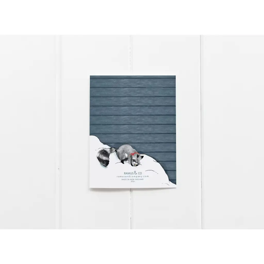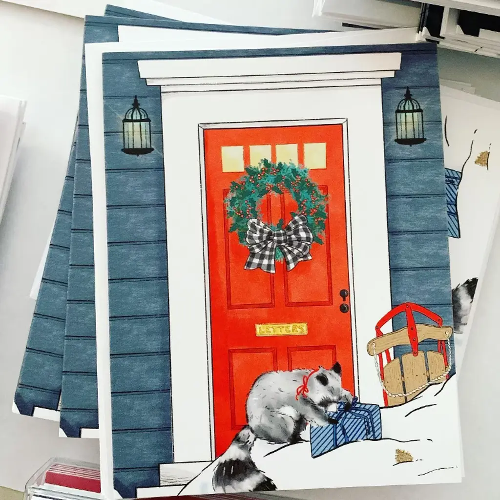 This 8-pack of greeting cards is elegantly illustrated by artist Ingrid Ramus, founder and owner of the Ramus & Co brand. Artwork features a raccoon opening a Christmas gift. All greeting cards are made in the USA on heavyweight uncoated and locally-sourced and manufactured card stock. Each card is accompanied by a hand-embossed envelope made with heavyweight 95lb paper and a peel-and-stick flap - no licking envelopes here! All Ramus & Co. greeting cards are printed on FSC and SFI certified paper sourced from a regional mill that harnesses 66% of its energy from on-site sustainable sources, such as emission-free hydroelectricity and biomass co-generation from wood waste. All 8 greeting cards come packaged as a boxed set. Husband-and-wife team Calvin and Ingrid Ramus founded Ramus & Company in 2019, in New England, USA. Ingrid, the creative designer behind the brand, originates from Mexico, where she cultivated her skills in fashion and textile design. Drawing from her unique and inquisitive perspective on preppy style, Ingrid prolifically designs whimsical yet classic stationery and lifestyle items.