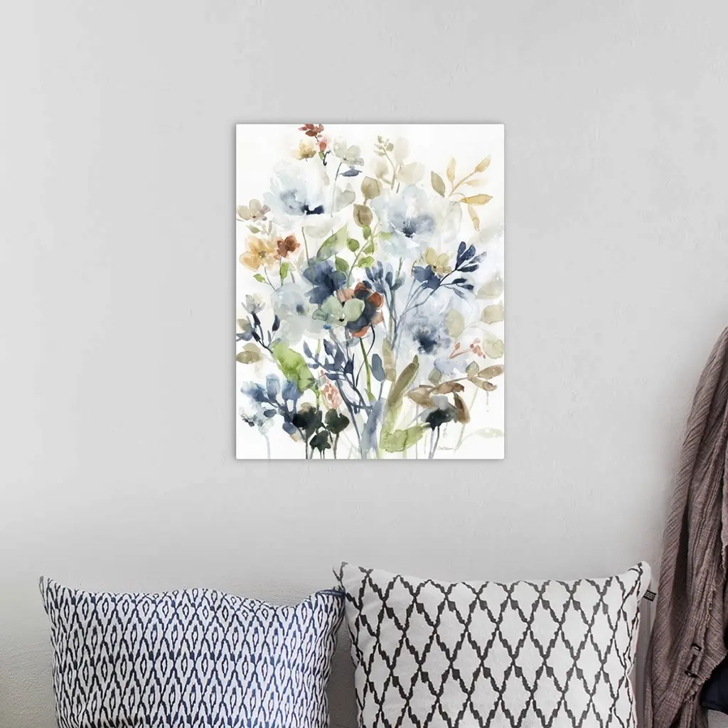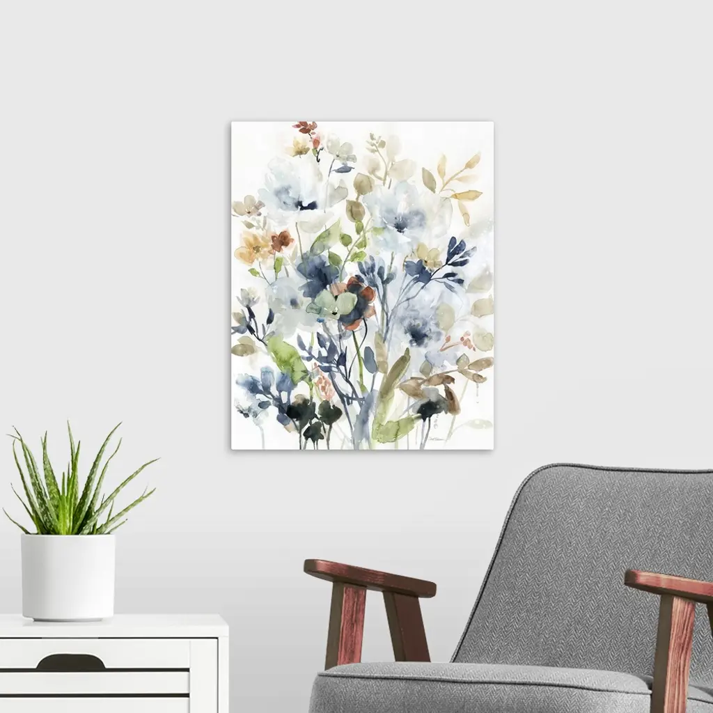 Watercolor painting of wildflowers in earthy colors on a white background.