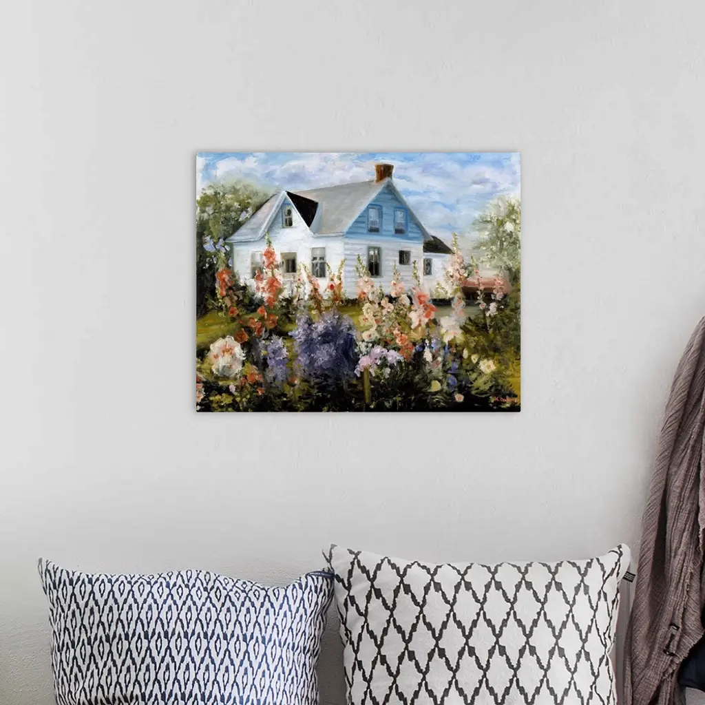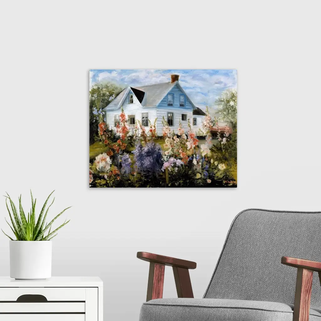 Contemporary artwork of hollyhocks in front of a rustic country building.