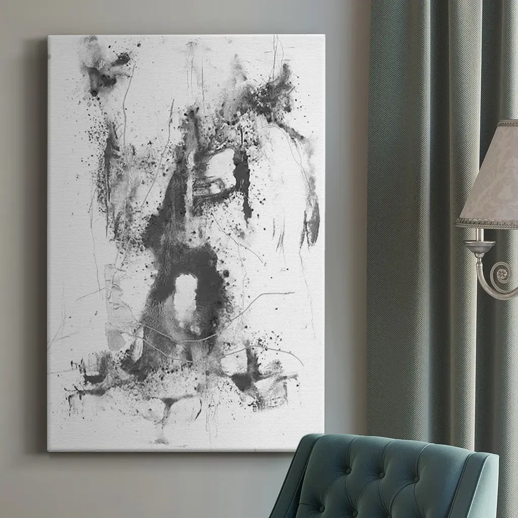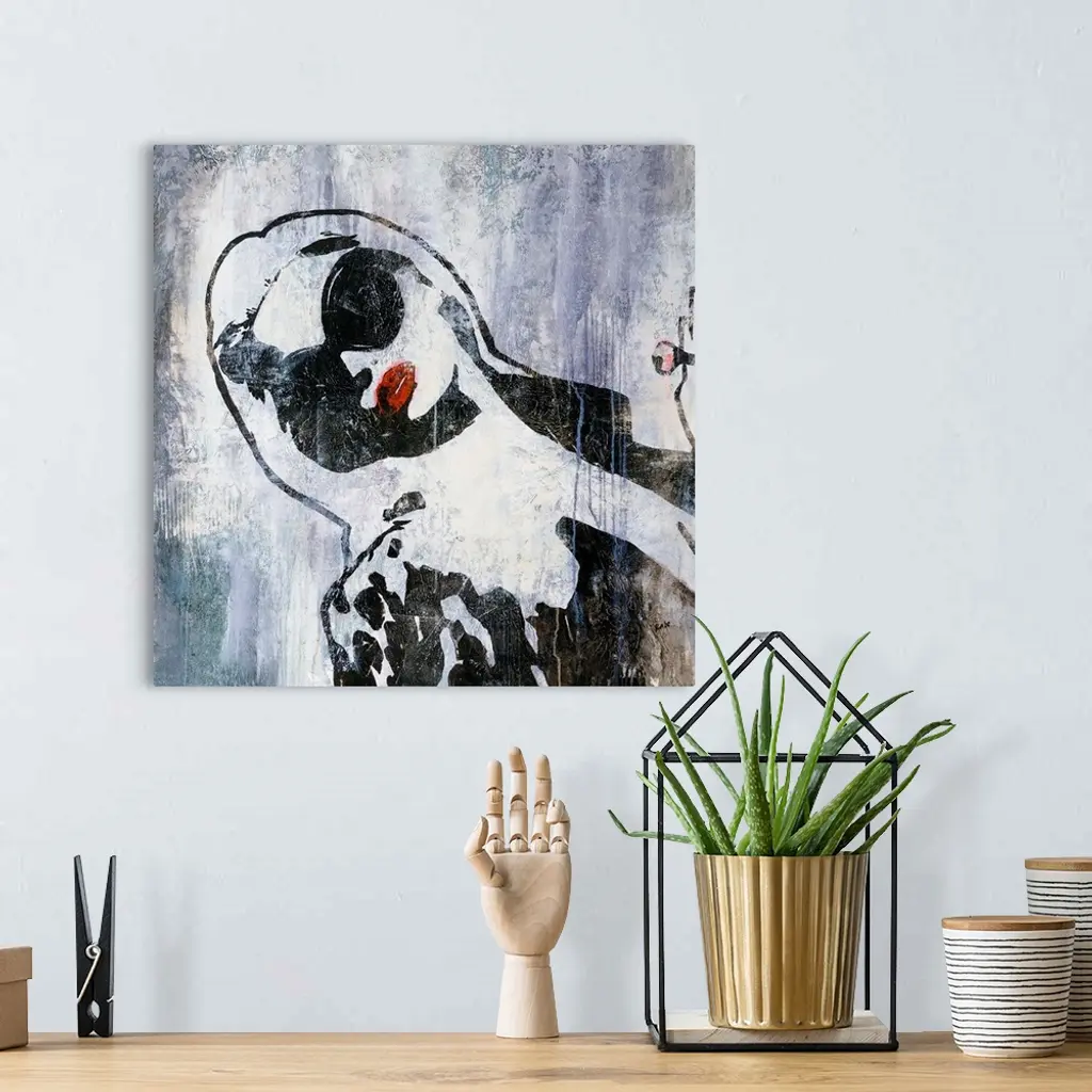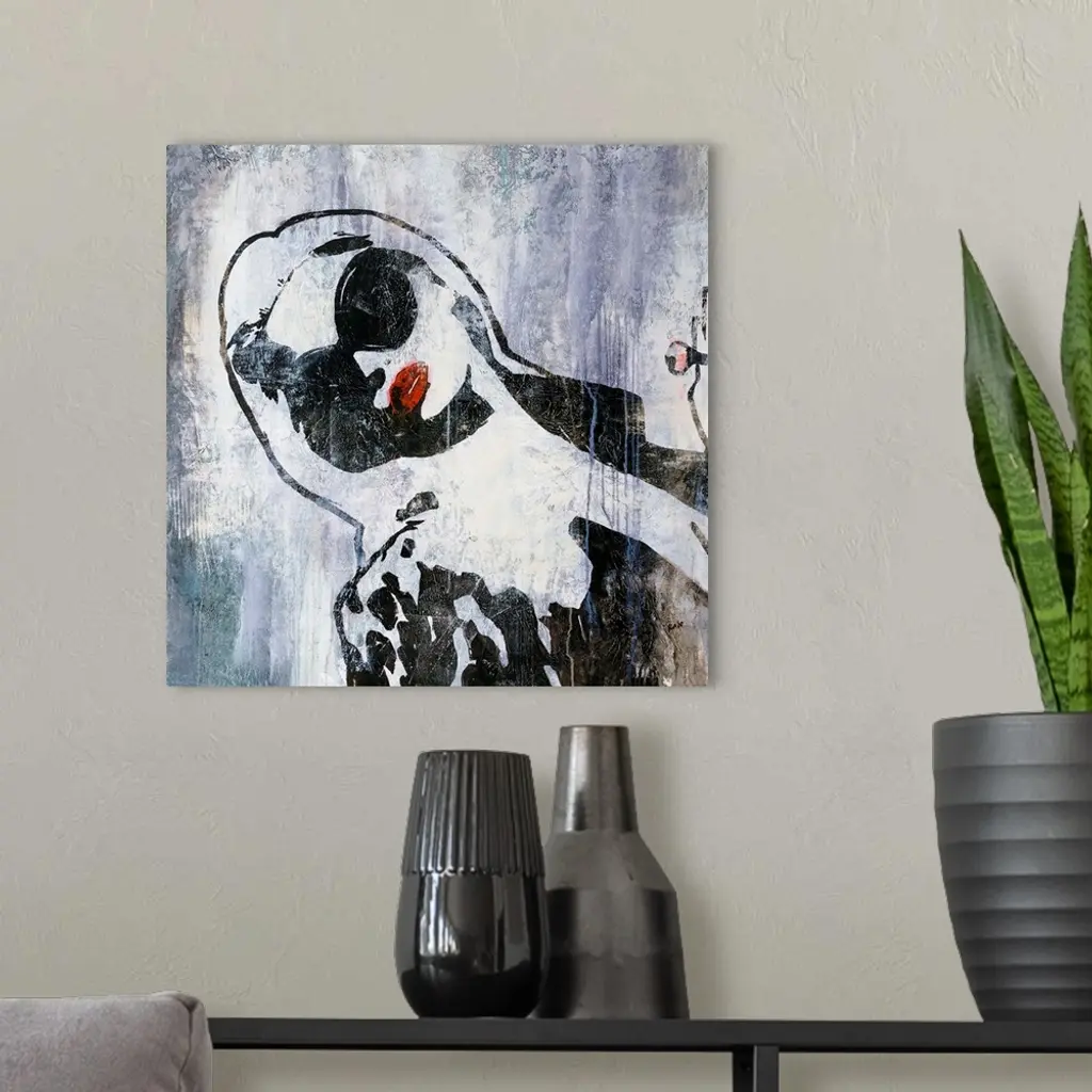 Grunge-style painting of a woman with large sunglasses and bright red lips leaning over, done in high contrast and lots of paint texture.