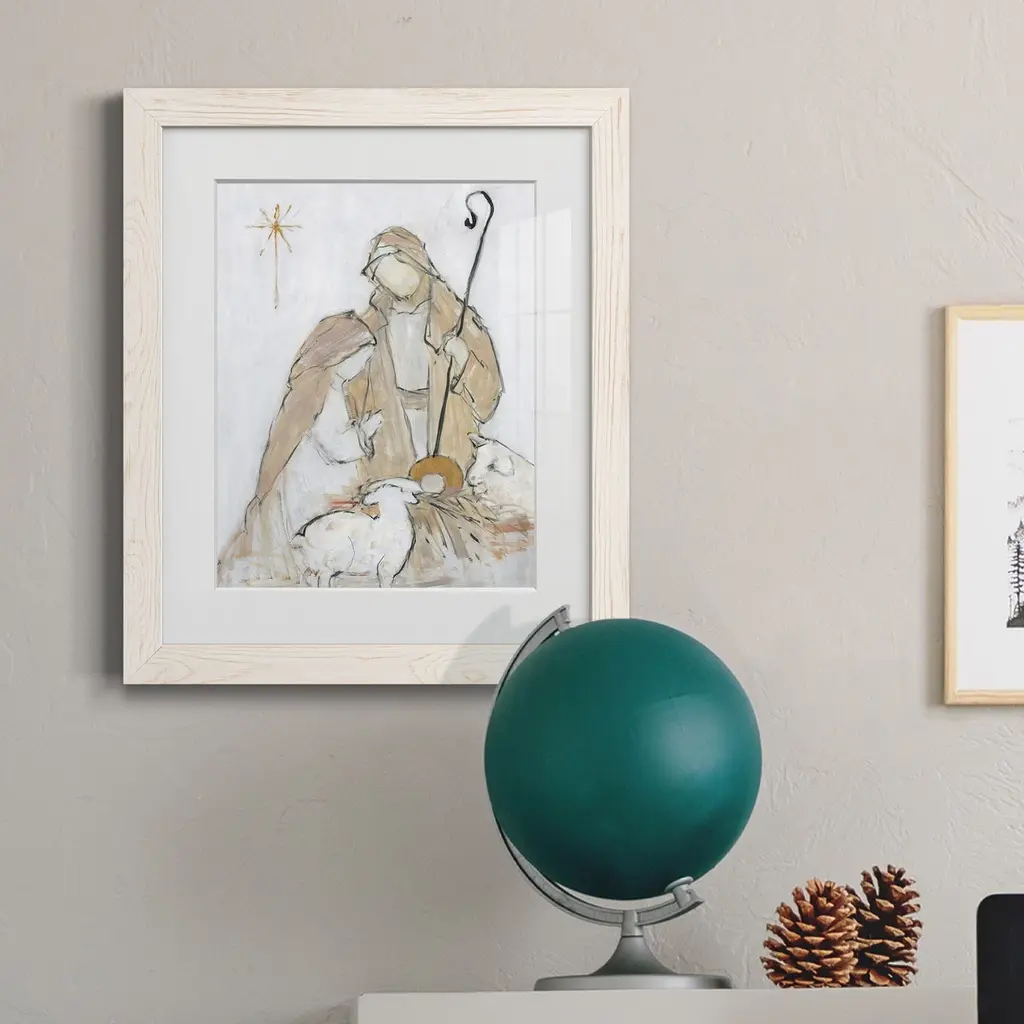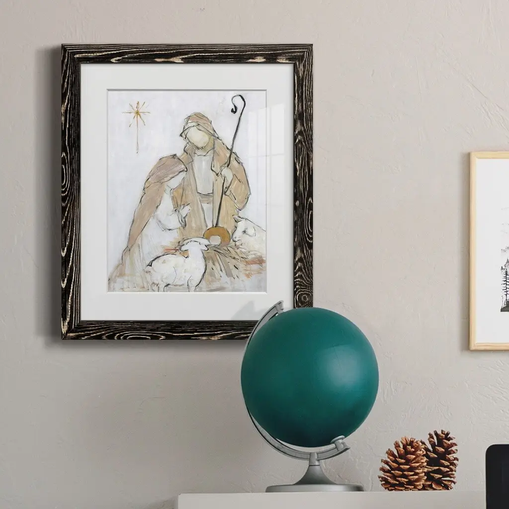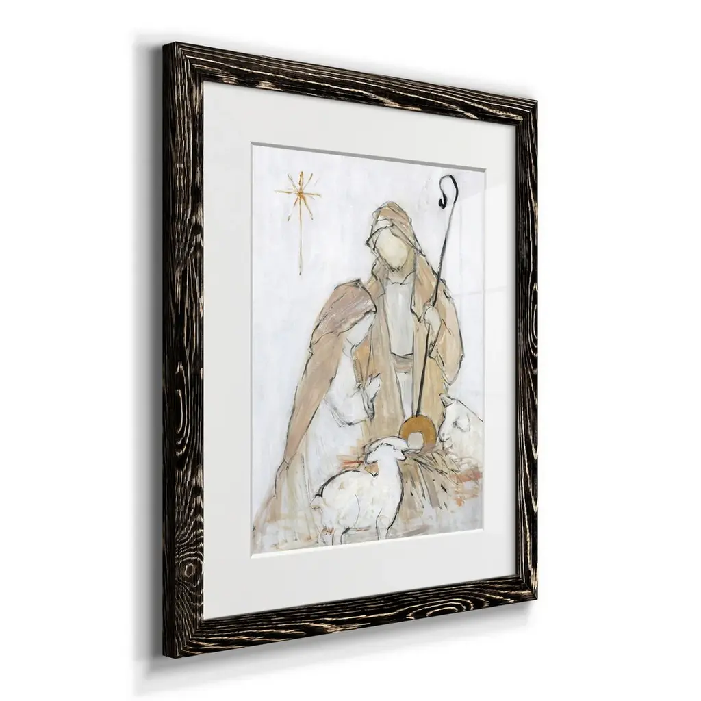 Holy Night Family-Premium Framed Print - Ready to Hang Framed in distressed wood and available in an array of sizes and colors Each piece is joined and assembled by hand and comes ready to hang 2 INCH BEVELED MATTE BOARD PLEXIGLASS COVERING READY TO HANG MADE IN THE USA SOLID WOOD FRAME MADE IN USA FADE RESISTANT GICLEE PRINTING on Canvas or Paper