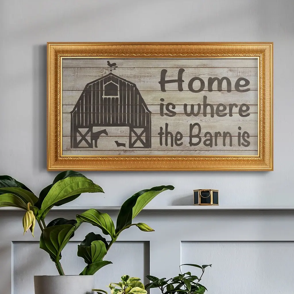 Home & Farm III Premium Framed Canvas- Ready to Hang A Premium Framed Canvas created to last. Framed in distressed wood and available in an array of sizes and colors Featuring a beveled a solid wood stretcher bar, each piece comes ready to hand 3 SIZES AVAILABLE 21''X37'' - Overall Size 25''X45'' - Overall Size 29''x53'' - Overall Size Each piece is made to order. Each piece comes with hanging hardware. Made in the USA Ready to Hang Giclee Paper Print Acrylic Glass Beveled Matt Board