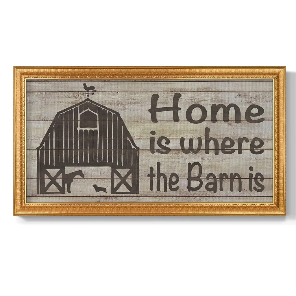 Home & Farm III Premium Framed Canvas- Ready to Hang A Premium Framed Canvas created to last. Framed in distressed wood and available in an array of sizes and colors Featuring a beveled a solid wood stretcher bar, each piece comes ready to hand 3 SIZES AVAILABLE 21''X37'' - Overall Size 25''X45'' - Overall Size 29''x53'' - Overall Size Each piece is made to order. Each piece comes with hanging hardware. Made in the USA Ready to Hang Giclee Paper Print Acrylic Glass Beveled Matt Board
