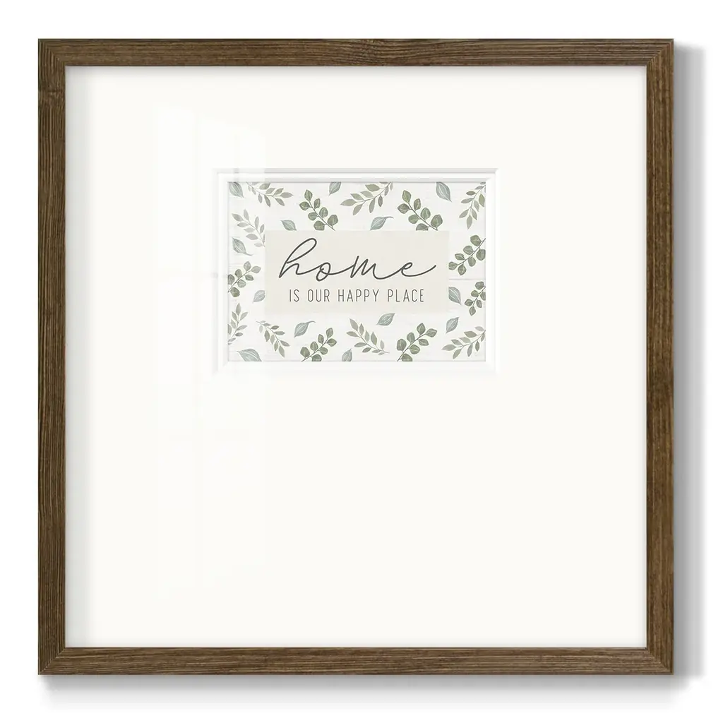 Home is Our Happy PlacePremium Framed Print A framed cold pressed paper print featuring superior double matting and quality frame. 2 SIZES AVAILABLE 16''X16''' - Overall Size 20''X20''' - Overall Size Each piece is made to order. Each piece comes with hanging hardware. Made in the USA Ready to Hang Giclee Paper Print Plexiglass Beveled Matt Board Double Matte Board