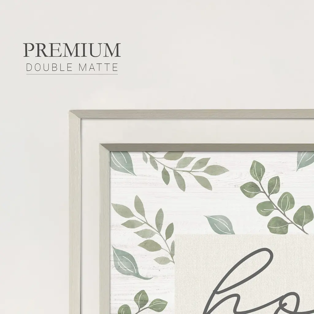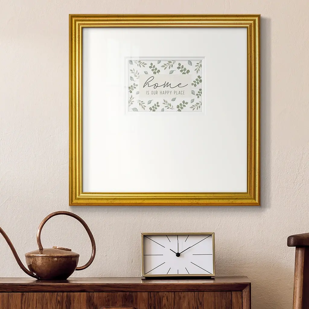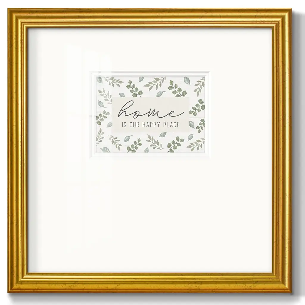Home is Our Happy PlacePremium Framed Print A framed cold pressed paper print featuring superior double matting and quality frame. 2 SIZES AVAILABLE 16''X16''' - Overall Size 20''X20''' - Overall Size Each piece is made to order. Each piece comes with hanging hardware. Made in the USA Ready to Hang Giclee Paper Print Plexiglass Beveled Matt Board Double Matte Board