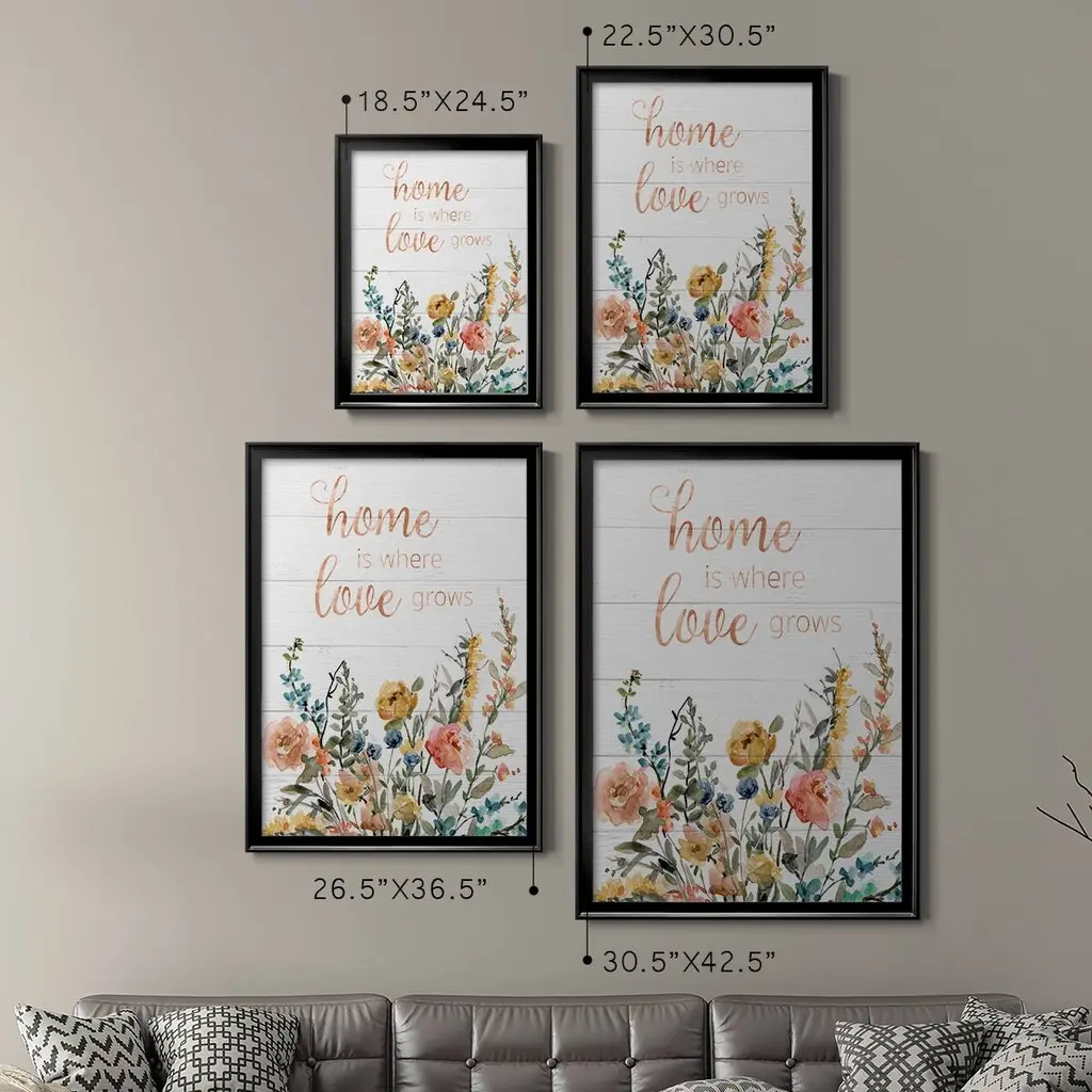 Home is Where Love Grows Premium Framed Print - Ready to Hang A Premium Framed Print created to last. Framed in distressed wood and available in an array of sizes and colors Featuring a beveled a solid wood stretcher bar, each piece comes ready to hand 4 SIZES AVAILABLE 30.5''X42.5'' - Overall Size 26.5'X36.5'' - Overall Size 22.5''x30.5'' - Overall Size 18.5''x24.5'' - Overall Size Each piece is made to order. Each piece comes with hanging hardware. Made in the USA Ready to Hang