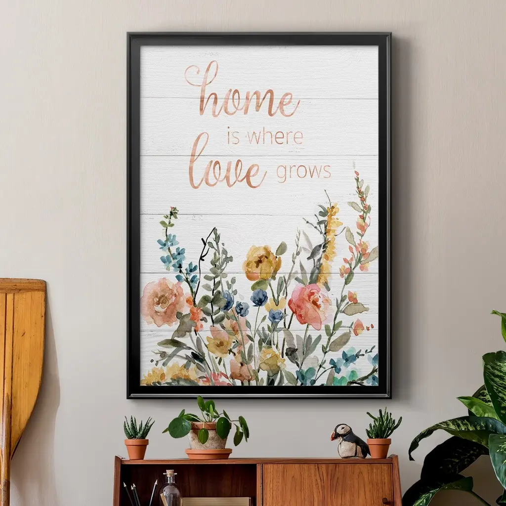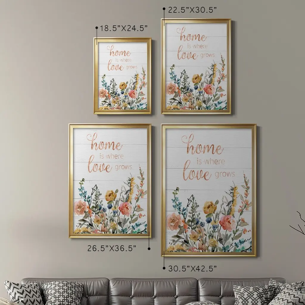 Home is Where Love Grows Premium Framed Print - Ready to Hang A Premium Framed Print created to last. Framed in distressed wood and available in an array of sizes and colors Featuring a beveled a solid wood stretcher bar, each piece comes ready to hand 4 SIZES AVAILABLE 30.5''X42.5'' - Overall Size 26.5'X36.5'' - Overall Size 22.5''x30.5'' - Overall Size 18.5''x24.5'' - Overall Size Each piece is made to order. Each piece comes with hanging hardware. Made in the USA Ready to Hang