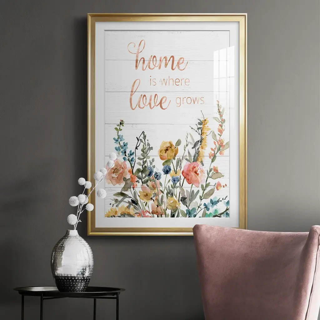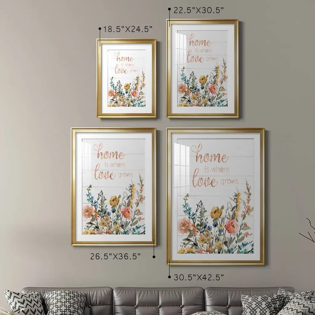Home is Where Love Grows Premium Framed Print - Ready to Hang A Premium Framed Print created to last. Framed in distressed wood and available in an array of sizes and colors Featuring a beveled a solid wood stretcher bar, each piece comes ready to hand 4 SIZES AVAILABLE 30.5''X42.5'' - Overall Size 26.5'X36.5'' - Overall Size 22.5''x30.5'' - Overall Size 18.5''x24.5'' - Overall Size Each piece is made to order. Each piece comes with hanging hardware. Made in the USA Ready to Hang Giclee Paper Print Acrylic Glass Beveled Matt Board
